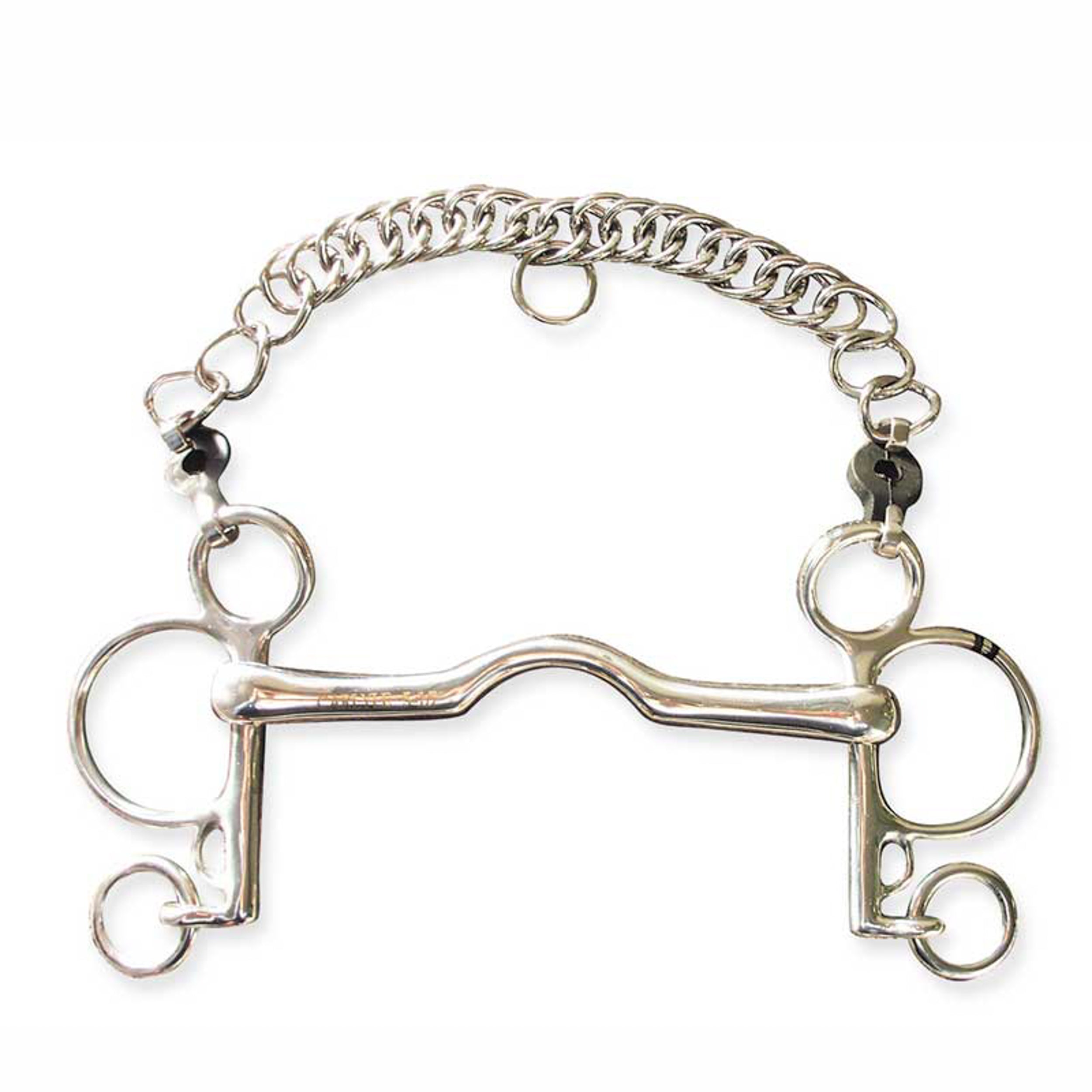 This Metalab Low Port Pelham is a Level 4 bit made of stainless steel. Mouthpiece is 15mm diameter. Cheeks are 4". Curb chain and hooks included.