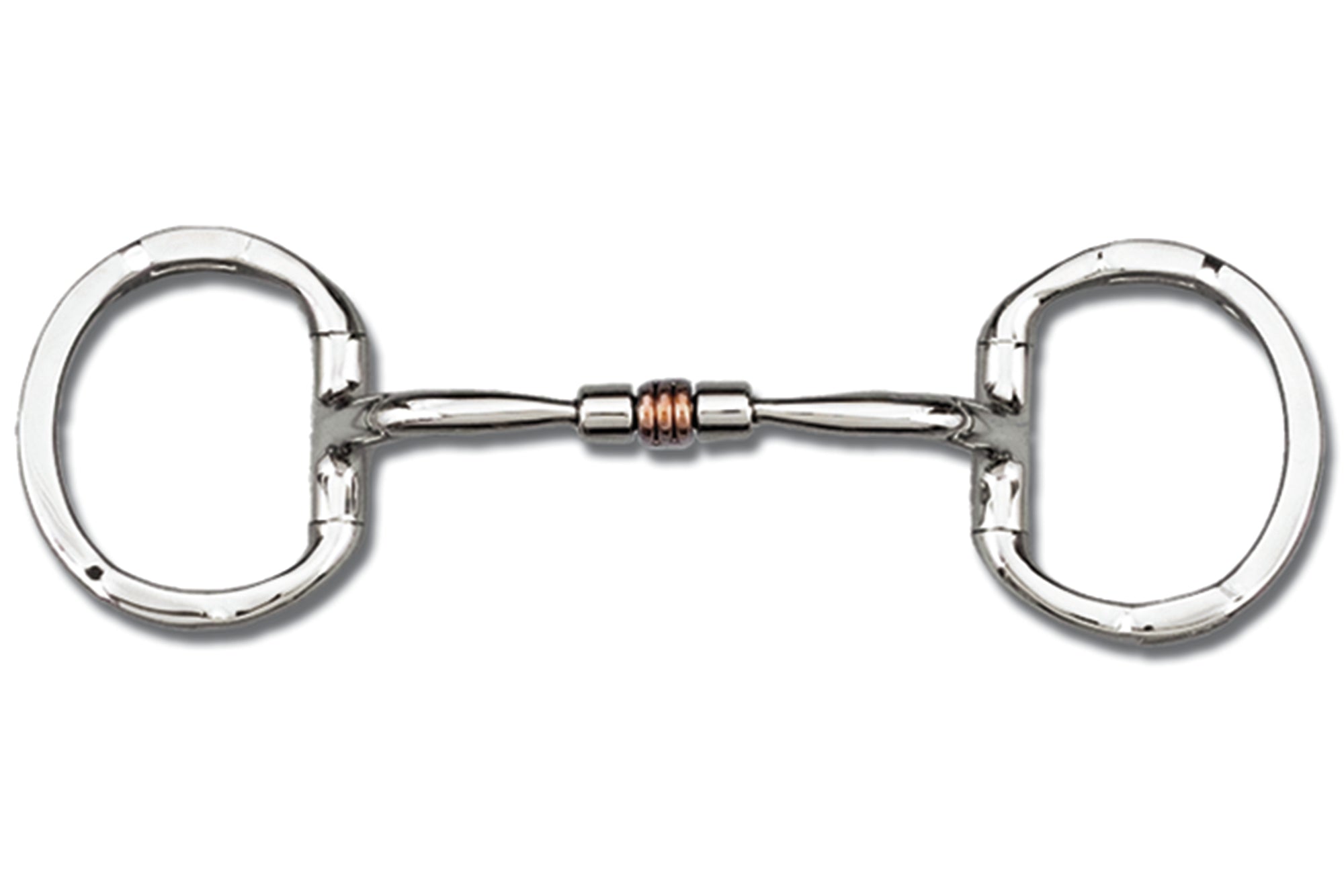 The bridle and reins slots, along with curb hooks, aid in Independent Side Movement™, which allows the rider to isolate one side of the bit for bending and lifting the shoulder while balancing the mouthpiece in the bridle. Stainless steel with copper inlay and copper roller.
