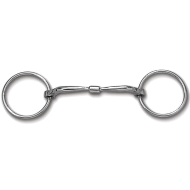 The loose ring is a simple stainless steel O-shape where both the bridle and mouthpiece have no fixed point of attachment but slide freely around the ring. The loose ring allows a lot of play as the mouthpiece slides freely around the ring.