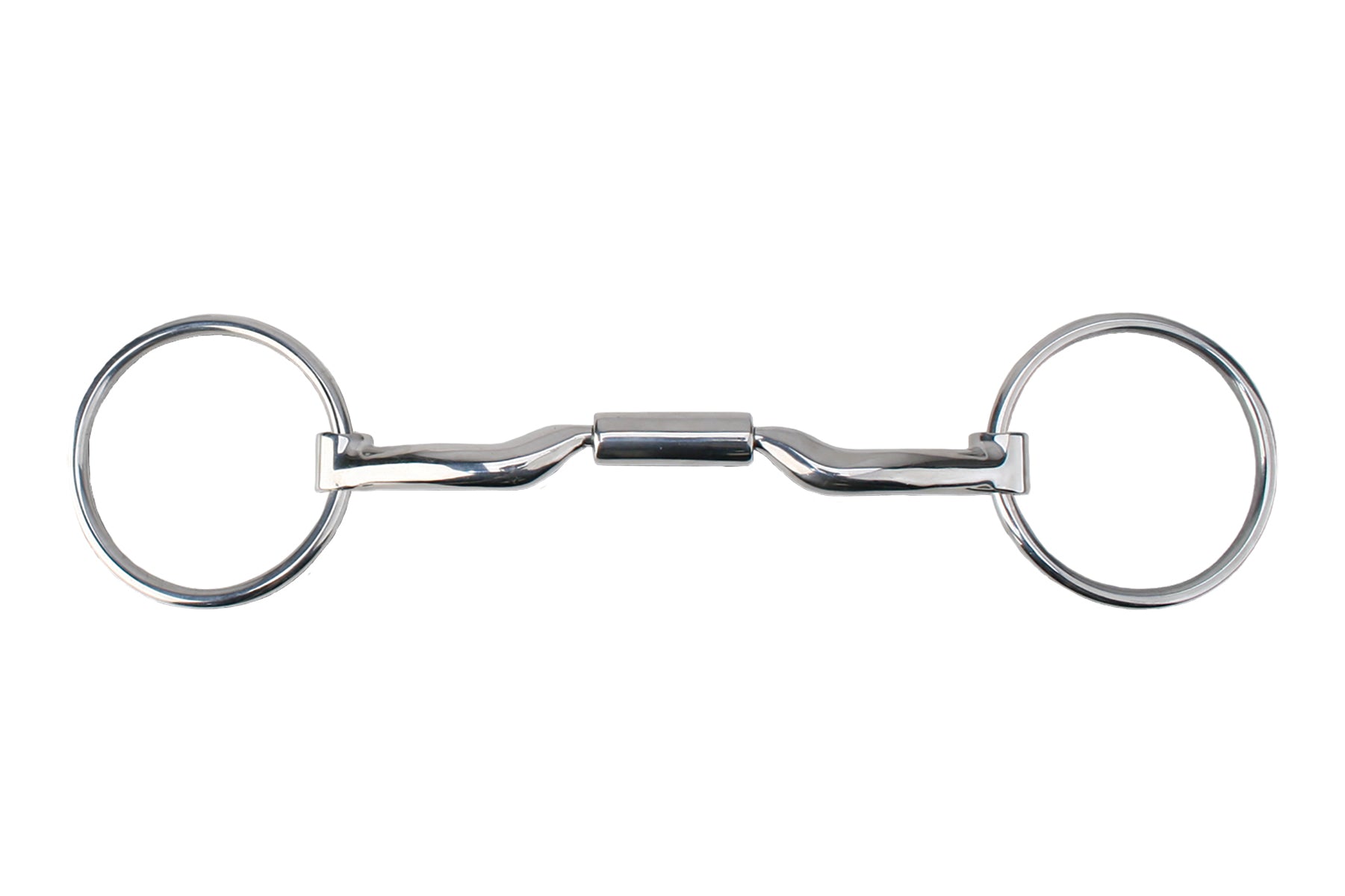 The mouthpiece is a mullen style and will not rotate down onto the tongue when the reins are engaged. The port on this bit is under 30mm, meeting the requirements for USEF and FEI dressage rules. Independent Side Movement™ allows the rider to isolate one side of the bit for bending, balancing or lifting a shoulder. Stainless steel with copper inlay.
