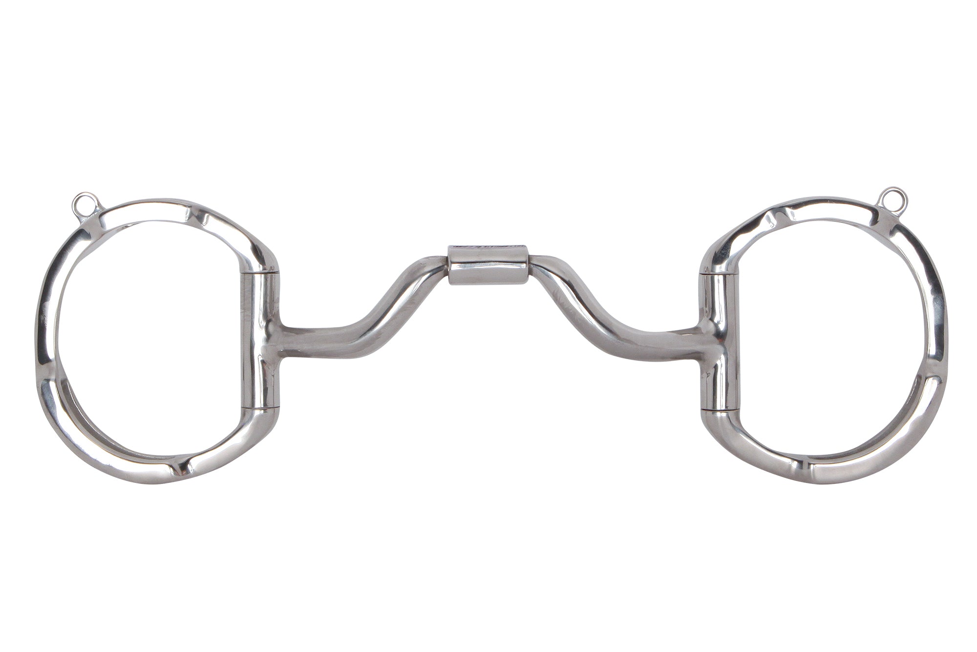 This mouthpiece applies little to no tongue pressure, working primarily off the bars, chin and poll. The bridle and reins slots, along with curb hooks, aid in Independent Side Movement™, which allows the rider to isolate one side of the bit for bending and lifting the shoulder while balancing the mouthpiece in the bridle. Stainless Steel with copper inlay.