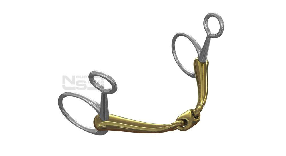 The Neue Schule Tranz Angled Lozenge Baucher Bit with 16 mm Salox® Gold mouth and stainless steel cheeks usually helps the rider achieve and maintain a rounder and more correct outline. This NS bit is often recommended if your horse is constantly resisting, strung out or coming above the bit as it offers additional directional control and can support straightness.