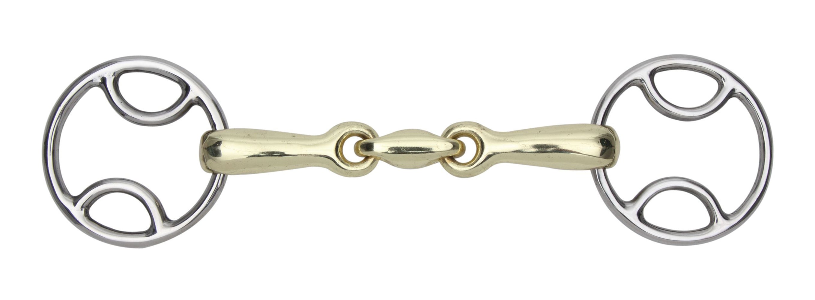 Shires Beval Bit with Lozenge allows mild leverage. A brass alloy mouthpiece aids salivation. Gentle rounded lozenge prevents the nutcracker effect of a single-joint bit. Mouthpiece thickness is 16mm; cheek height is 55mm (5"), 70mm (5.5").