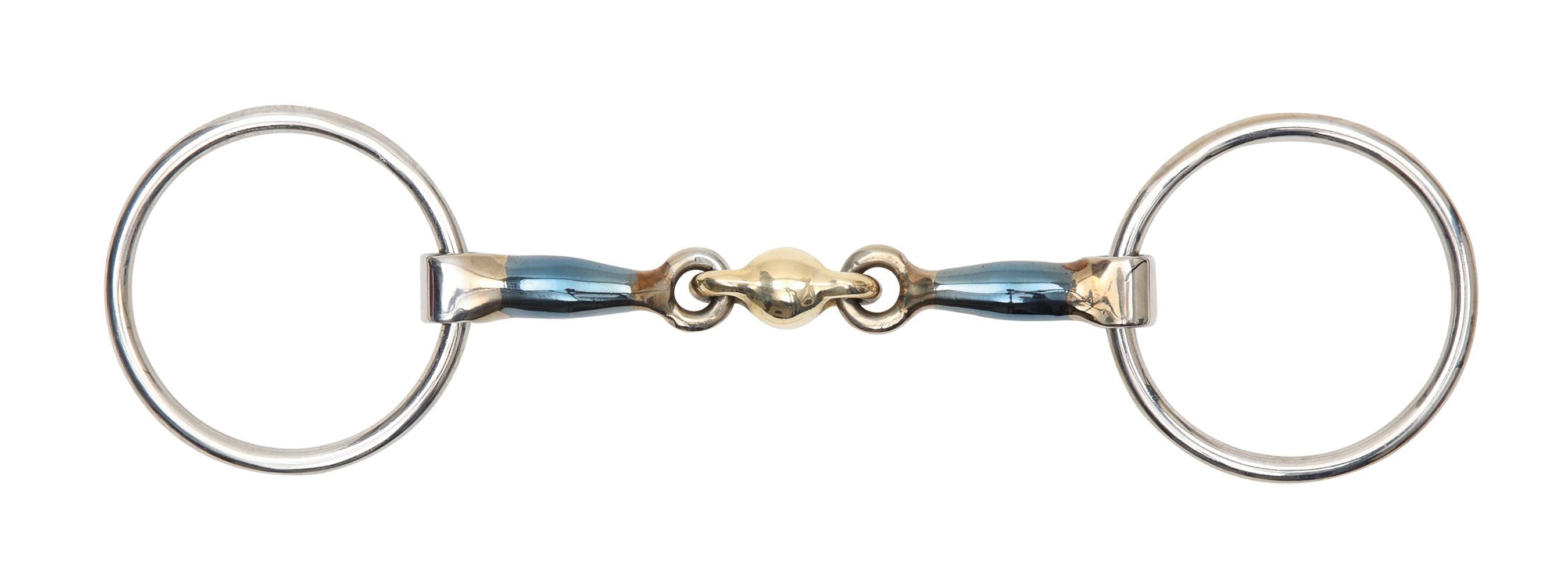 This Blue Alloy Loose Ring Bit with Lozenge has a design that can help discourage fixing and leaning. The loose rings offer much more movement than a fixed cheek provides to follow the angle of the tongue. The shaped brass alloy lozenge offers even pressure and encourages mouthing and contact, while eliminating the nutcracker effect of a single joint bit.