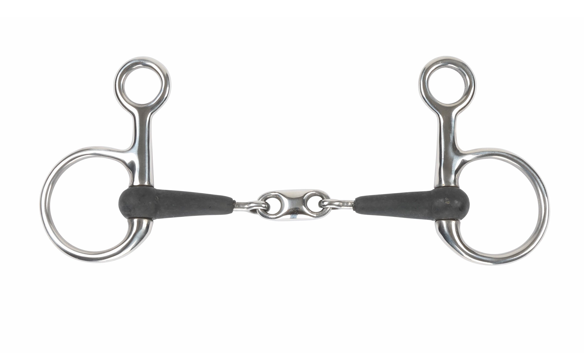 The Equikind+ Hanging Cheek Peanut Link Bit from Shires exerts a little poll pressure to encourage flexion. The peanut link in the mouthpiece distributes pressure over both the tongue and bars of the mouth to encourage mouthing and contact. A thin coating of rubber makes this bit milder than a traditional metal bit as it softer on the bars and lips. Mouthpiece is 14mm; rings are 110mm.
