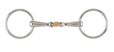 The Stübben 2-in-1 Loose Ring Bit has a 16mm stainless steel mouth with a sweet copper center link and 70mm stainless steel rings. This bit is designed to be used in two ways for different levels of impact. If the more angular side of the bit is buckled so that it face’s the horse’s tongue, the pressure occurs more selectively. If the round side is buckled toward the tongue, a softer impact is created. A + sign at one end of the mouthpiece helps you discern which level is in effect. If the + is visible from the left side of the horse, the more effective use of the bit is in effect. If the + sign cannot be seen on the left side, then the softer level is in effect. Changing the buckling occasionally may help prevent desensitization of the horse’s mouth. The sweet copper center link encourages bit acceptance by promoting chewing and salivation.