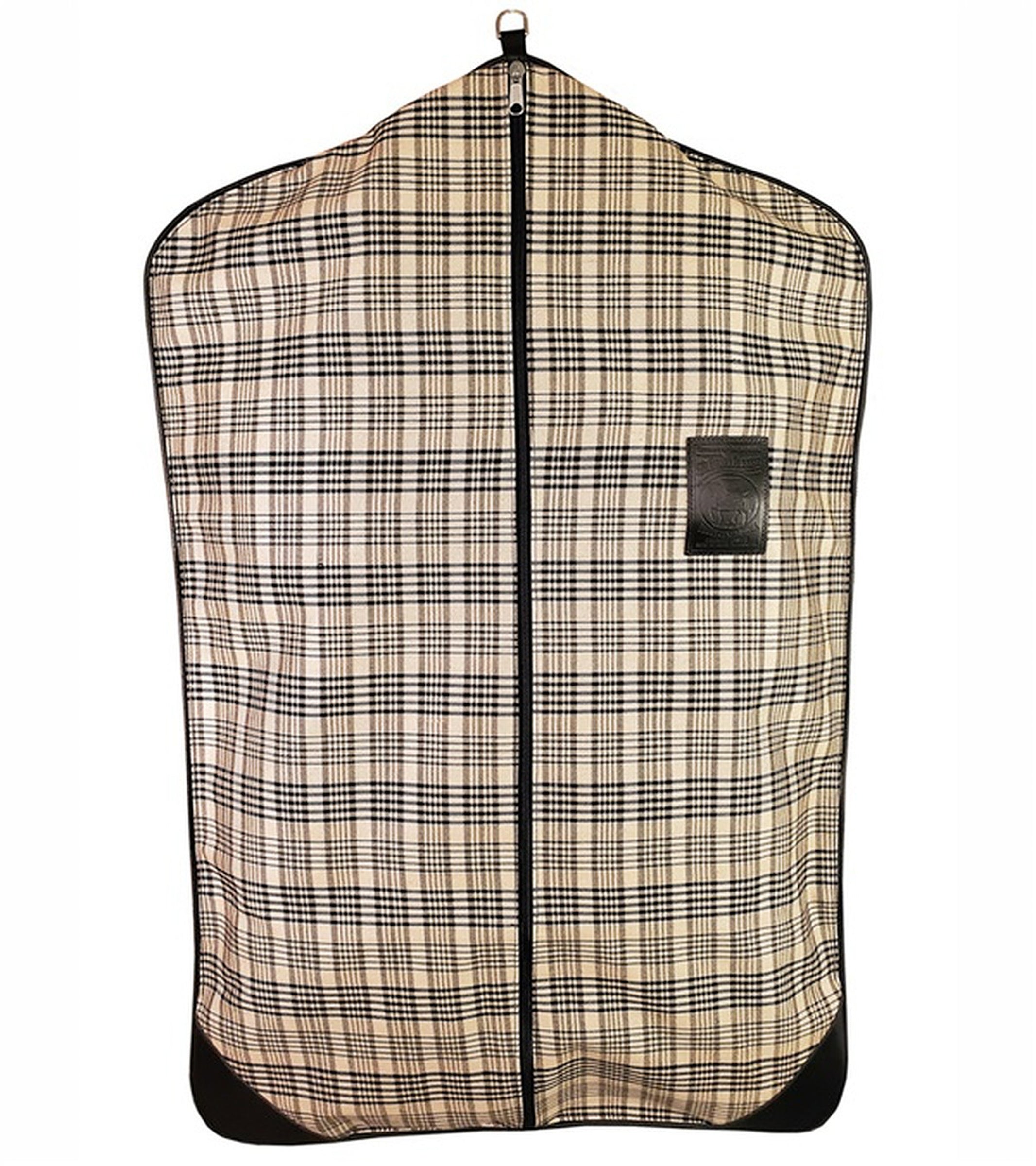 Carry, store and protect your show clothes in the 5/A Baker® Garment Carrier. Made with Original Baker Plaid fabric it is fully lined, trimmed with the finest quality leather and beautifully finished. A full front zipper opens to allow easy loading of your clothing. Metal ring at top for hanging.