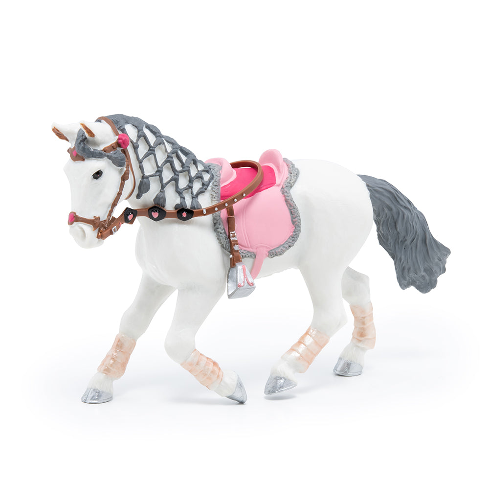 Papo White Pony (shown here with rider, sold separately) is all dressed up with braided mane and golden leg wraps. This high-quality toy is painstakingly detailed with hearts along her reins and rose-colored embellishments on her bridle and saddle. Note: Her tack coordinates with the Trendy Riding Girl, sold separately.