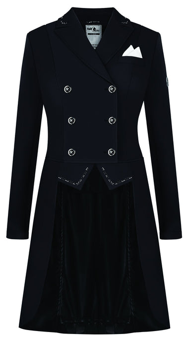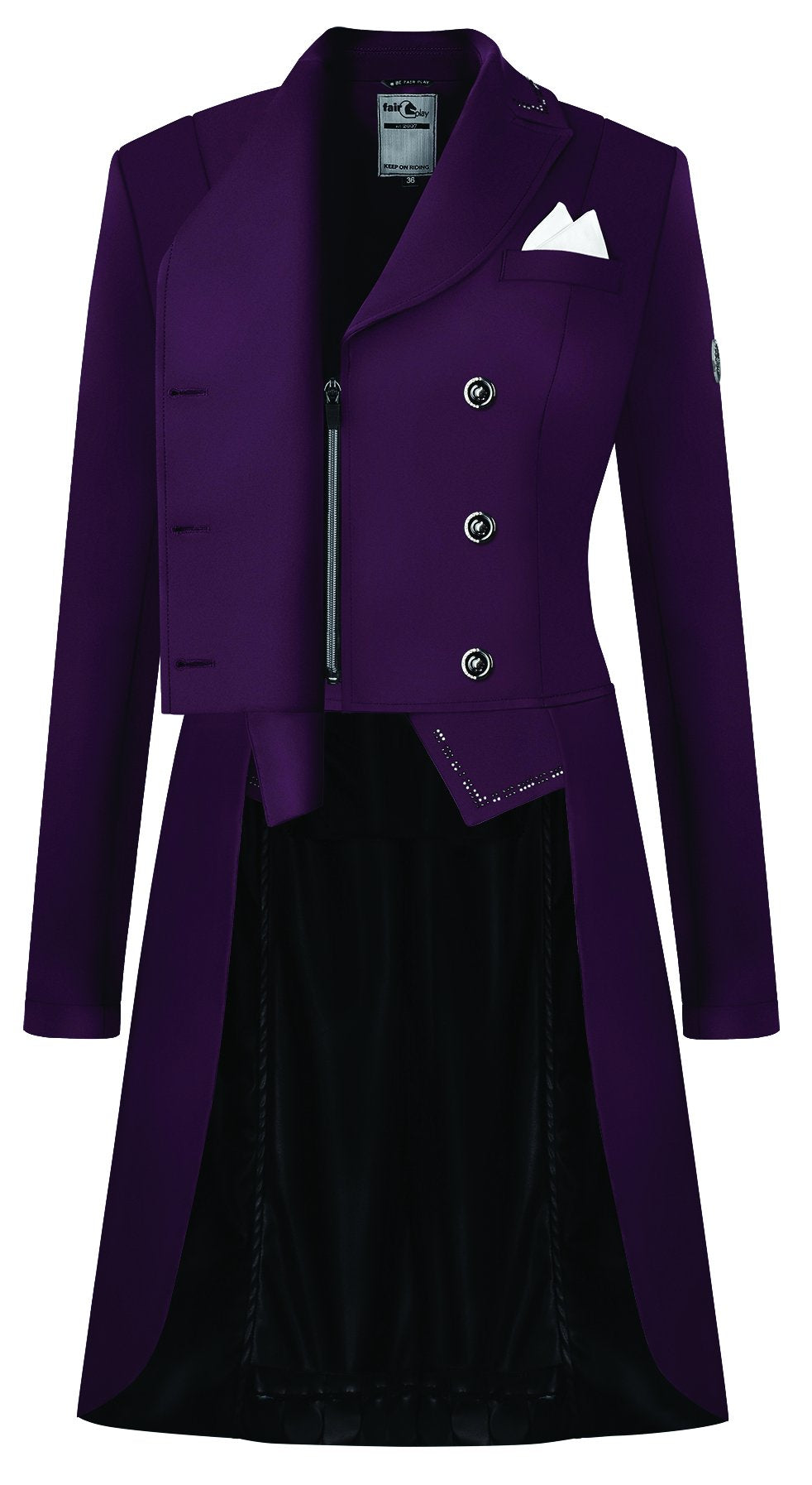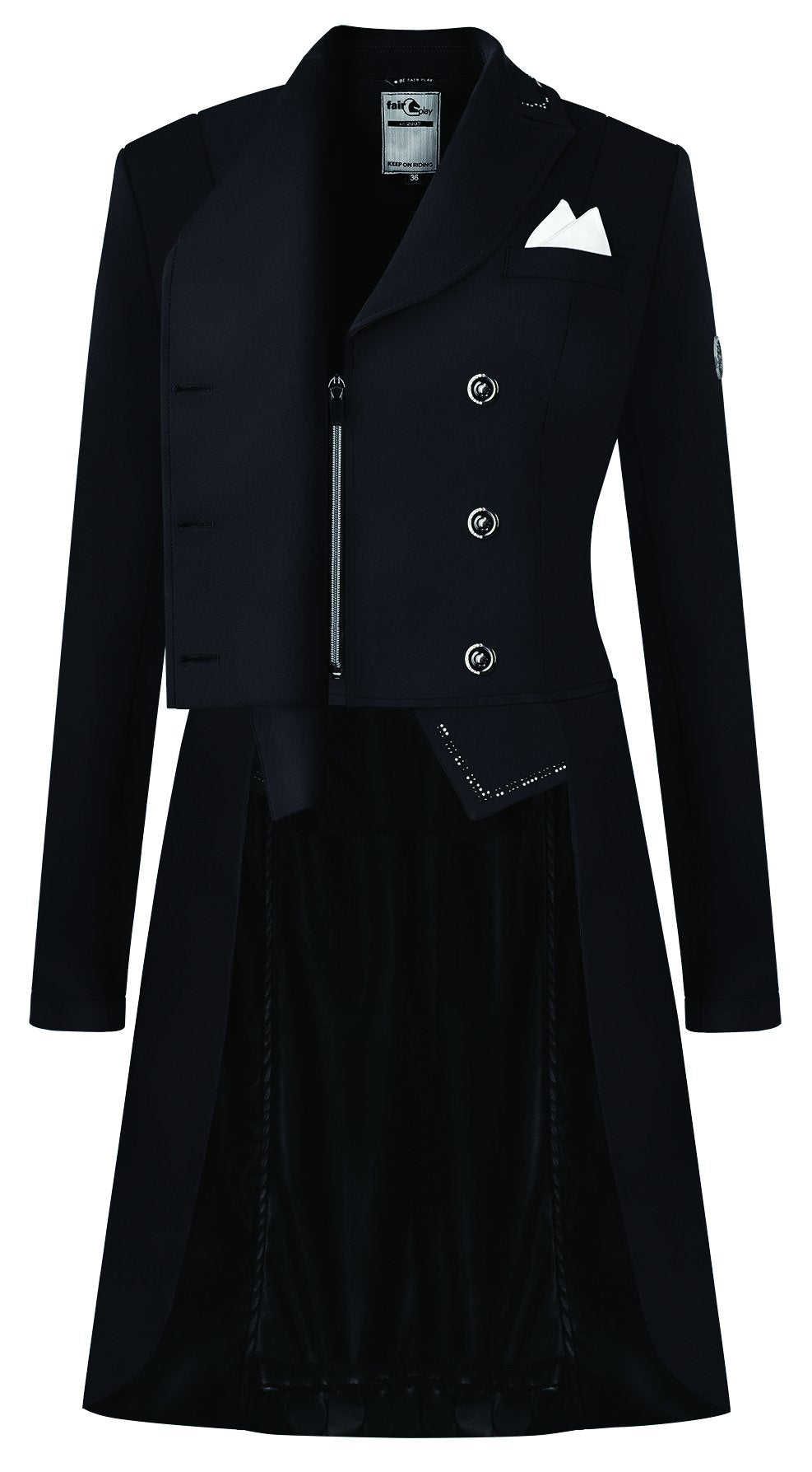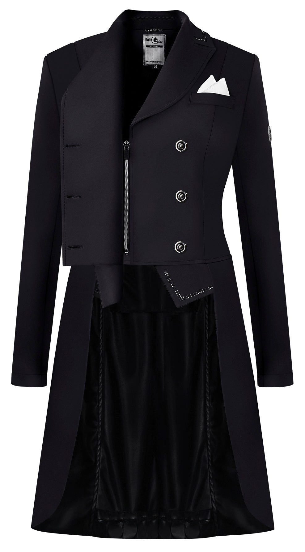 The elegant Fair Play® Nadine Shadbelly is beautifully tailored in elastic COMFINAT-tech™ fabric. This dressage tailcoat is highly breathable, extremely elastic and feels pleasant to the touch. The material provides long-lasting UV protection and resists wrinkles. Made with concern for the environment, it has innovative fibers derived from grain, unlike other polyester yarns. A mesh lining in the body promotes air circulation, while the tails are weighted evenly and lined with synthetic leather.