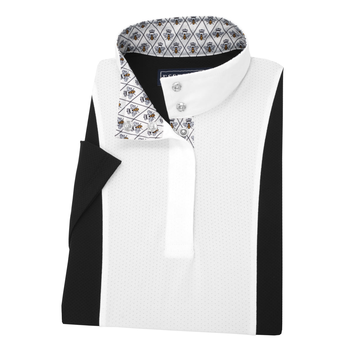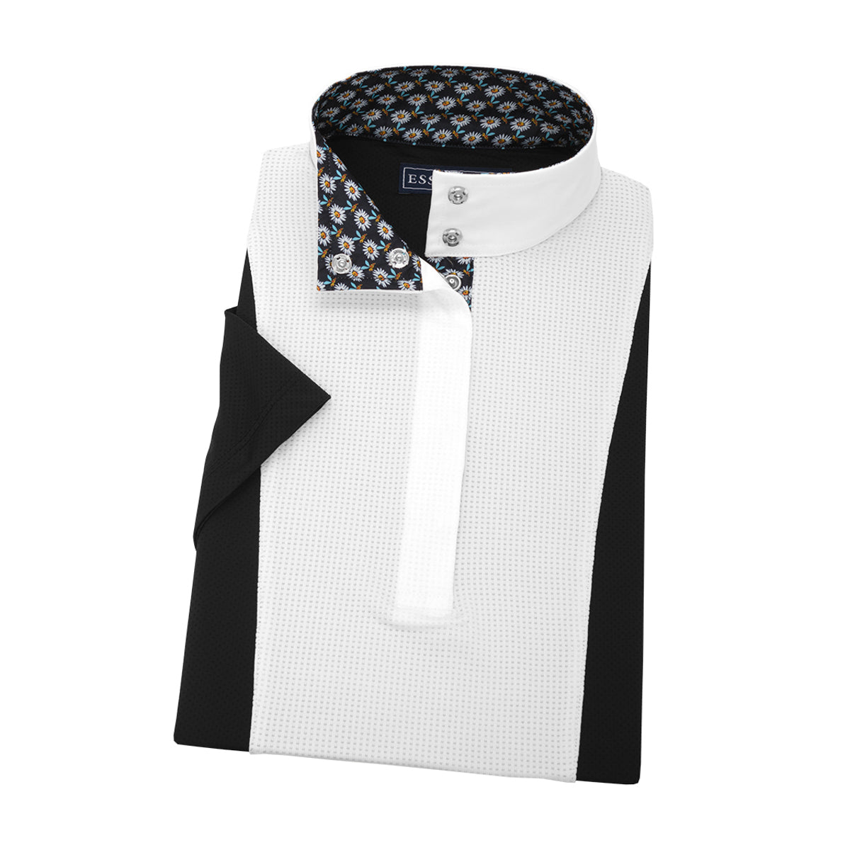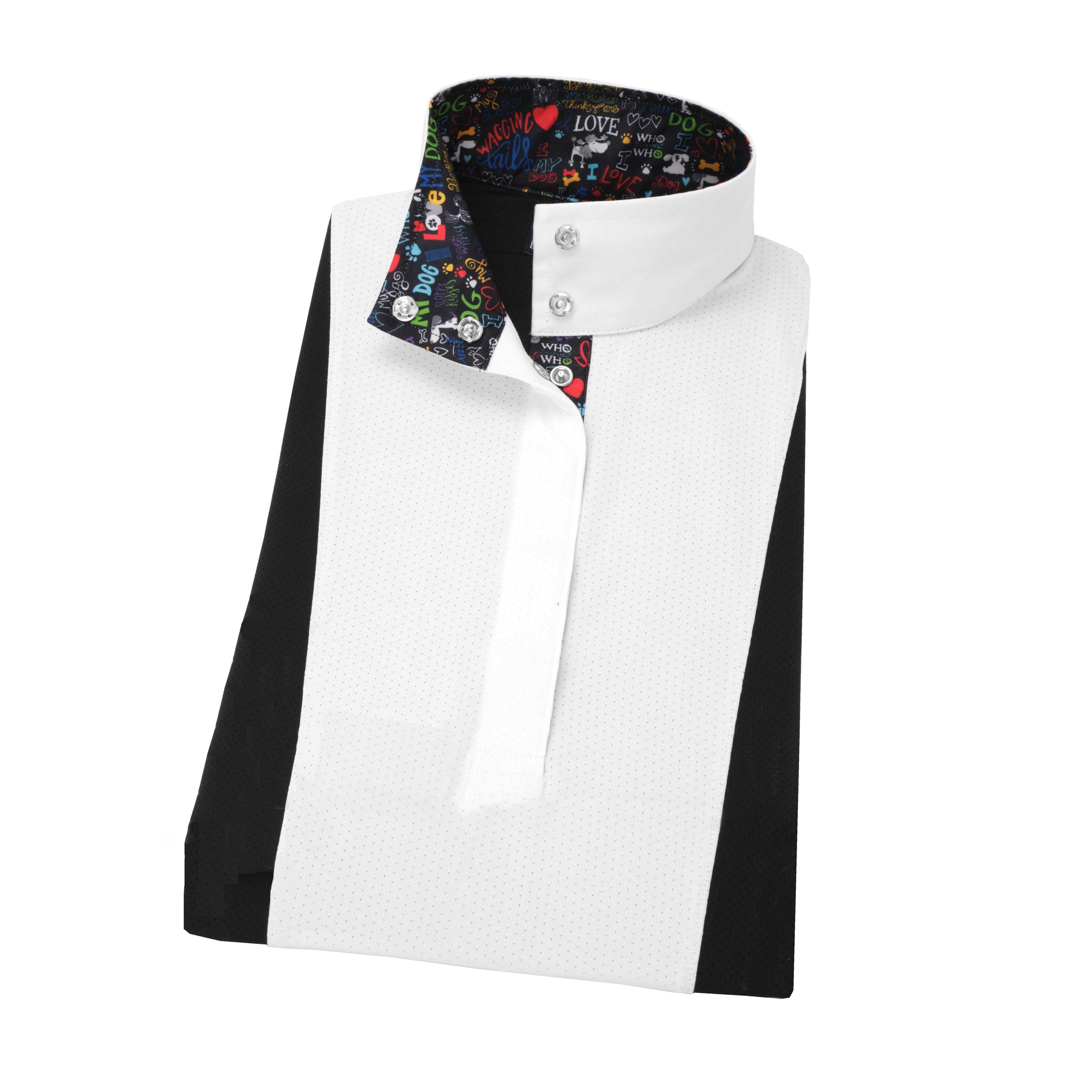 This pullover children’s show top features a white, full-length panel front with crisp white show collar that looks classic under a show coat. Solid sides and back and print trim details offer great style.