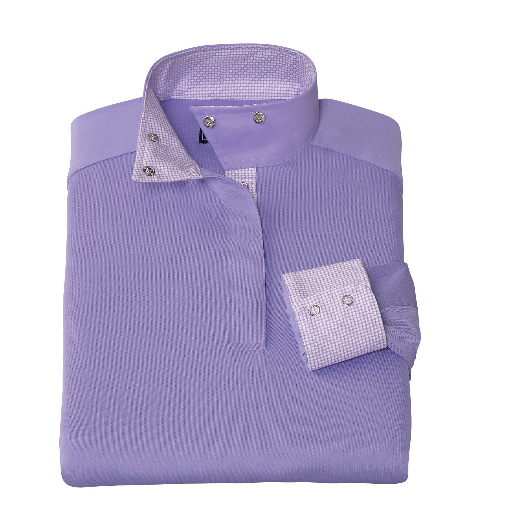 A best selling design, this Essex Classics Talent Yarn® Long Sleeve Competition Shirt is an incredible value during manufacturer's closeout. This elegant, long sleeve ladies’ show shirt has a covered snap closure half-placket and wrap neck along with snap cuffs for a finished look. Talent Yarn fabric wicks moisture and offers both UV protection and antibacterial properties. Mesh under the arms helps keep you cool. Collar and cuffs are woven for a traditional look and trimmed with a contrasting pattern.