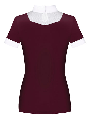 The Fair Play® Lara Short Sleeve Show Shirt is a pretty competition style. Made of elastic, breathable, recycled technical fabric, it wicks moisture and helps protect skin from UV rays. White-and-silver stretch lace inserts add flair on the front and back. The stand-up collar is decorated with crystals and fastens in back with two covered snaps.