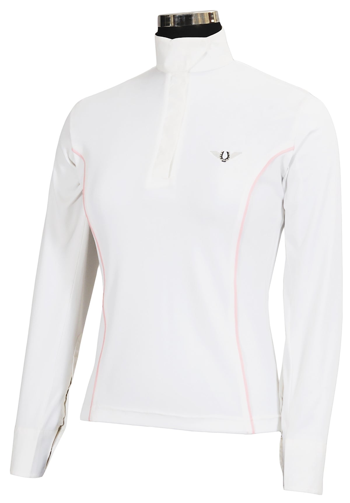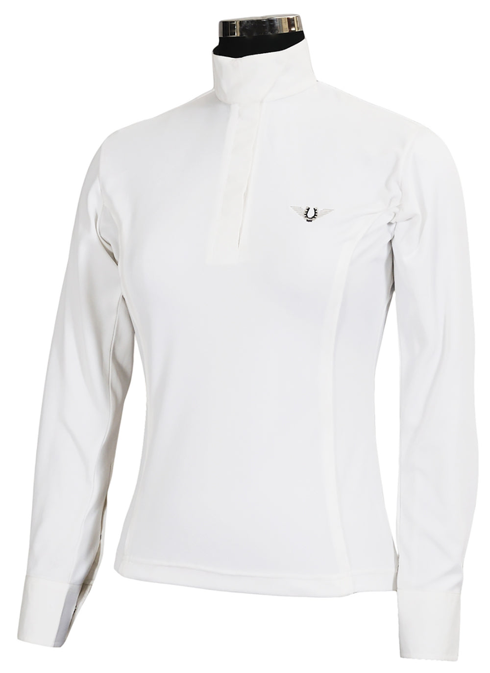 The TuffRider® Ladies′ Kirby Kwik Dry Long Sleeve Show Shirt is ideal on hot summer show days with its moisture-wicking fabric. This pullover show top has a covered snap half placket and a hidden-snap wrap collar that create a polished look. The woven collar and cuffs lend traditional style when the show coat is on.