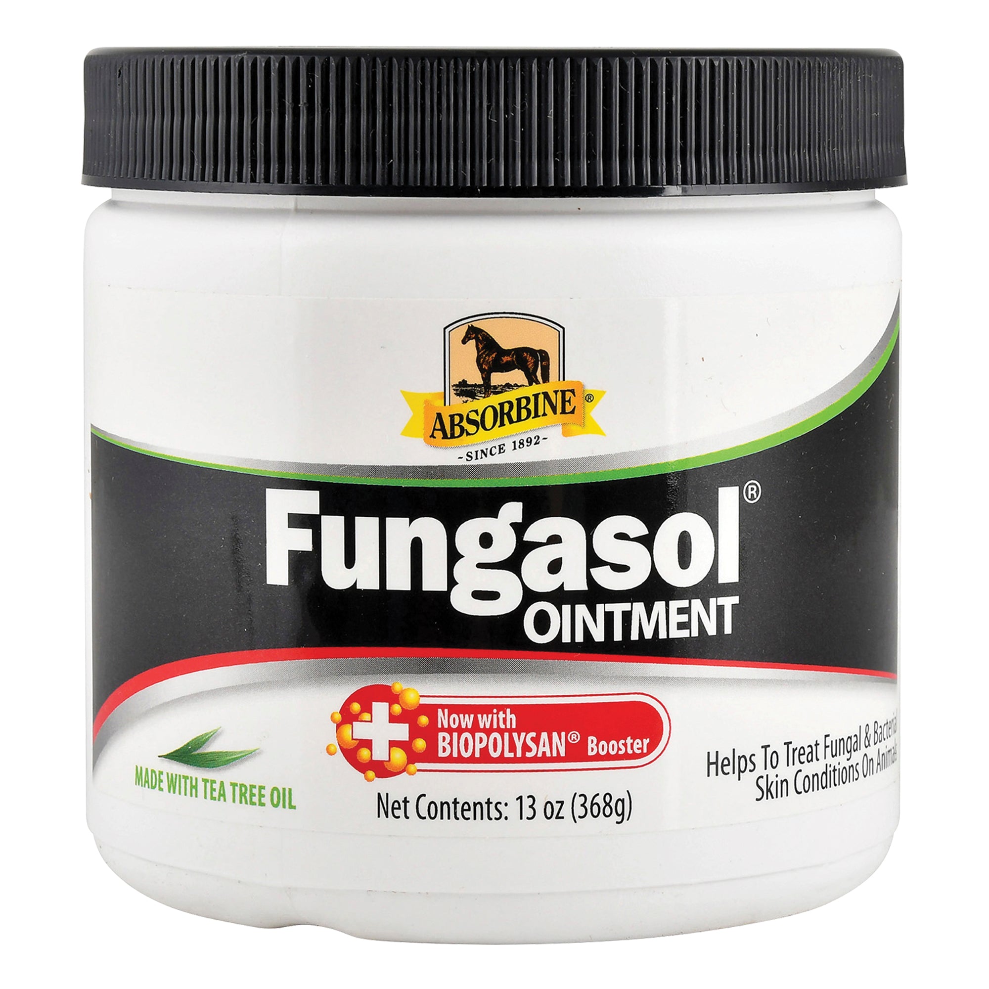 Absorbine® Fungasol® Ointment helps treat fungal and bacterial skin conditions on horses and other animals. Made with tea tree oil, Fungasol features Biopolysan® Booster, which has been proven to increase the effectiveness of the formula. This ointment is part of a complete system that lets you clean, treat and protect against rain rot, girth itch, scratches and tail rubbing as well as treat wound bacteria. 13 oz.