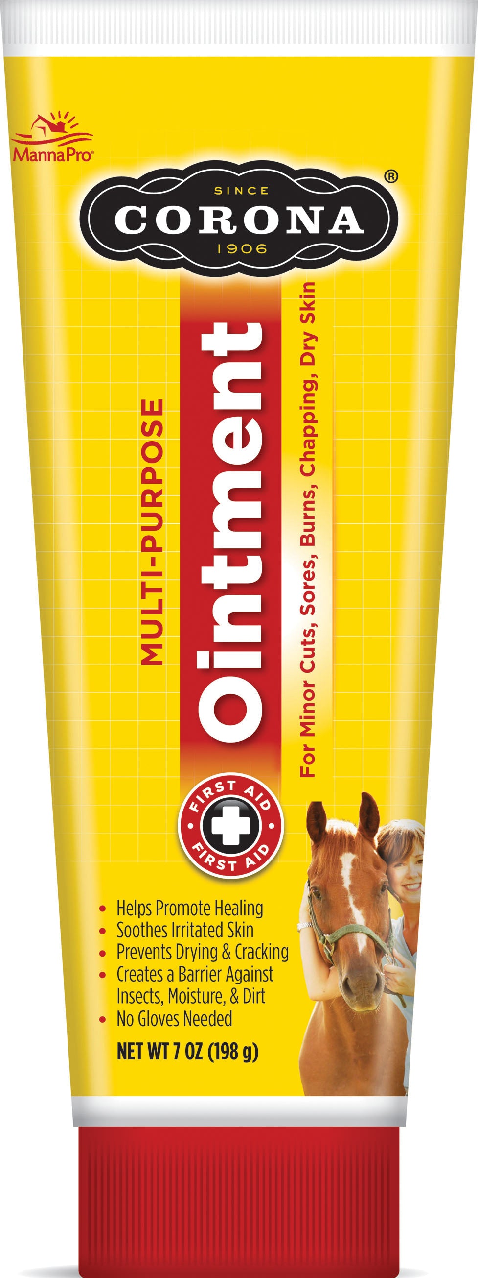 Corona® Ointment is an all-round wound cream containing 30% lanolin. Great for cuts, scratches, scrapes, saddle sores, rope burn, wind and sun-burned muzzles, it helps maintain proper moisture balance during the healing process. It may also be used on hooves to keep them moist and frogs supple. This ointment helps control the growth of microorganisms that could lead to infections. 7 oz.
