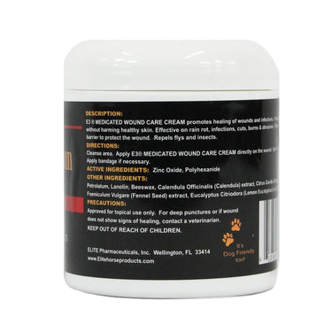 E3® Elite Equine Evolution Medicated Wound Care Cream helps promote healing of wounds on horses. This powerful medicated formula helps protect cuts, scratches and abrasions by forming a bandage-like seal to protect wounds against infection. It also has the effect of creating an insect barrier that repels flies, mosquitoes, gnats and other insects from coming in contact with the wound.