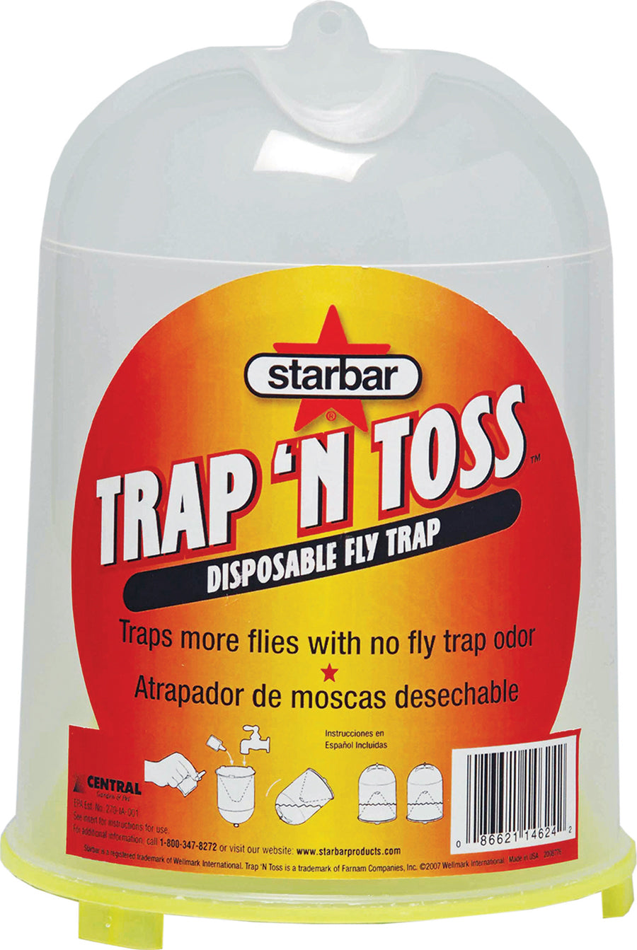 The Starbar® Trap-N-Toss™ Fly Trap is a handy, disposable fly trap that can be hung up or set down wherever flies are most active. The trap attracts and kills flies without insecticides and holds over 10,000 flies. When it fills up, toss it away and hang a fresh trap.