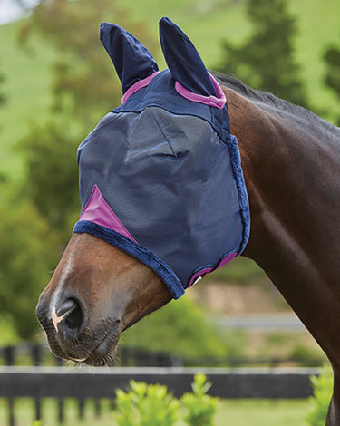 Air stream ear coves allow cooling ventilation as they keep flies out. Stretch fleece at the poll and soft fleece bindings offer added comfort. Adjustable, double-touch tape tabs allow ease of use and a secure fit.
