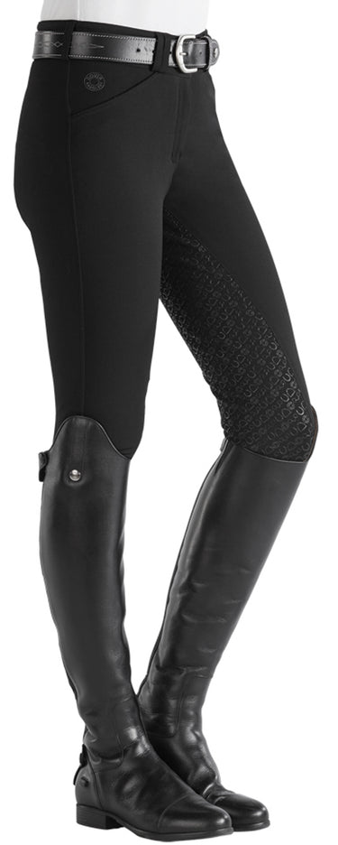 Wraparound sock bottoms are replaced with single-layer, high-stretch calf panels to provide a more custom fit and to eliminate bulk inside boots. Slash front pockets are made with low-profile stretch material for a no-show appearance on the outside and enhanced comfort on the inside. The silicone grip full seat boasts a stylish equestrian pattern and long-lasting grip.