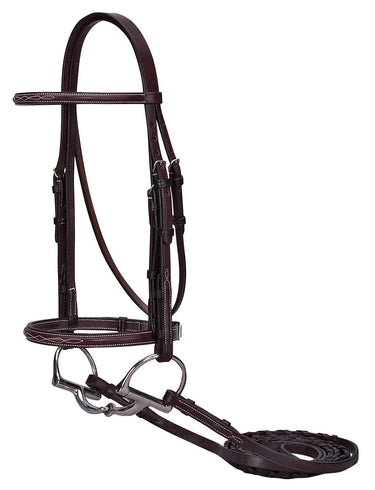 The Suffolk™ Hunter Fancy-Stitched Bridle with laced reins is attractive enough for shows and durable enough for schooling. Offering unprecedented quality at a great price, this timeless bridle comes in rich brown leather with a fancy-stitched browband and noseband. Hook stud ends.