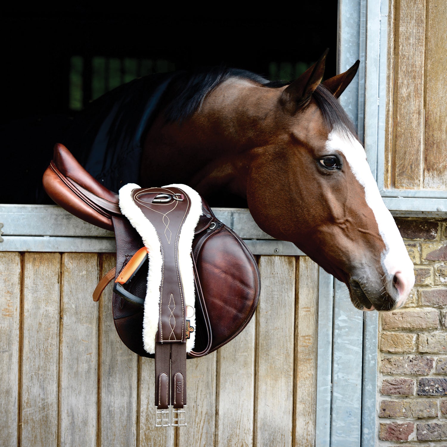 The manmade leather is durable, easy to maintain and resists dirt, sweat and water. It does not change color and withstands heavy use. Hook-and-loop on the inside aspect attaches this ergonomic girth to an artificial sheepskin liner, which cushions the skin and allows airflow.