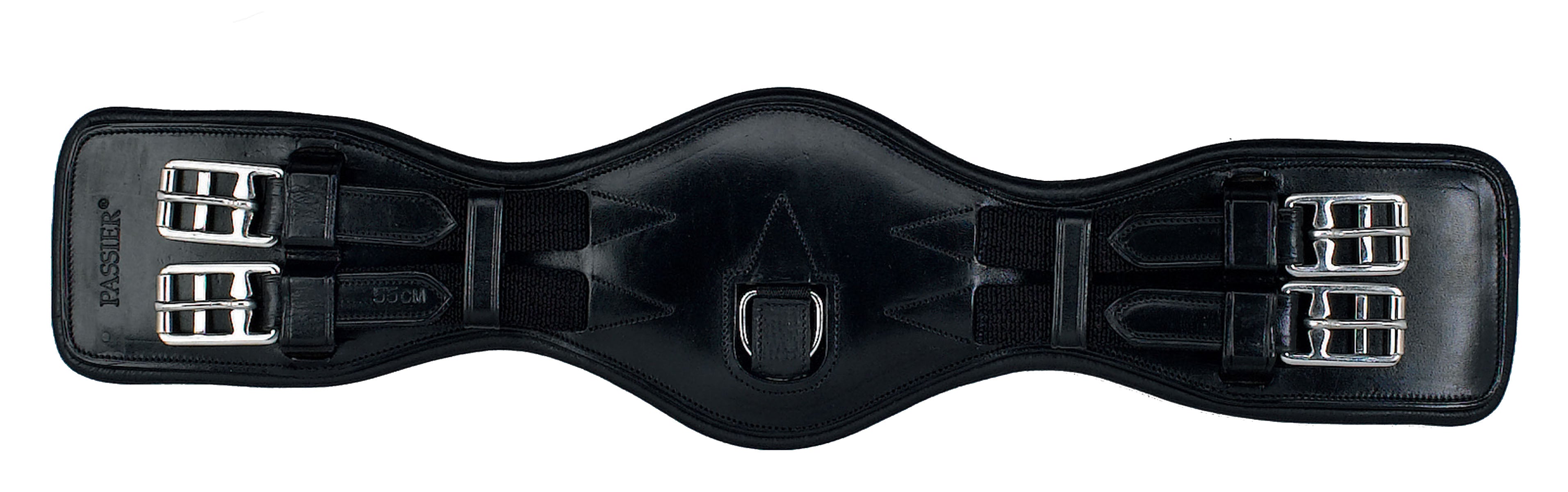 The Passier® Anatomic Dressage Girth is shaped and fully padded for horse comfort. Made of black leather, it has a concealed center d-ring for training aid attachment. Elastic at both ends with stainless steel roller buckles.