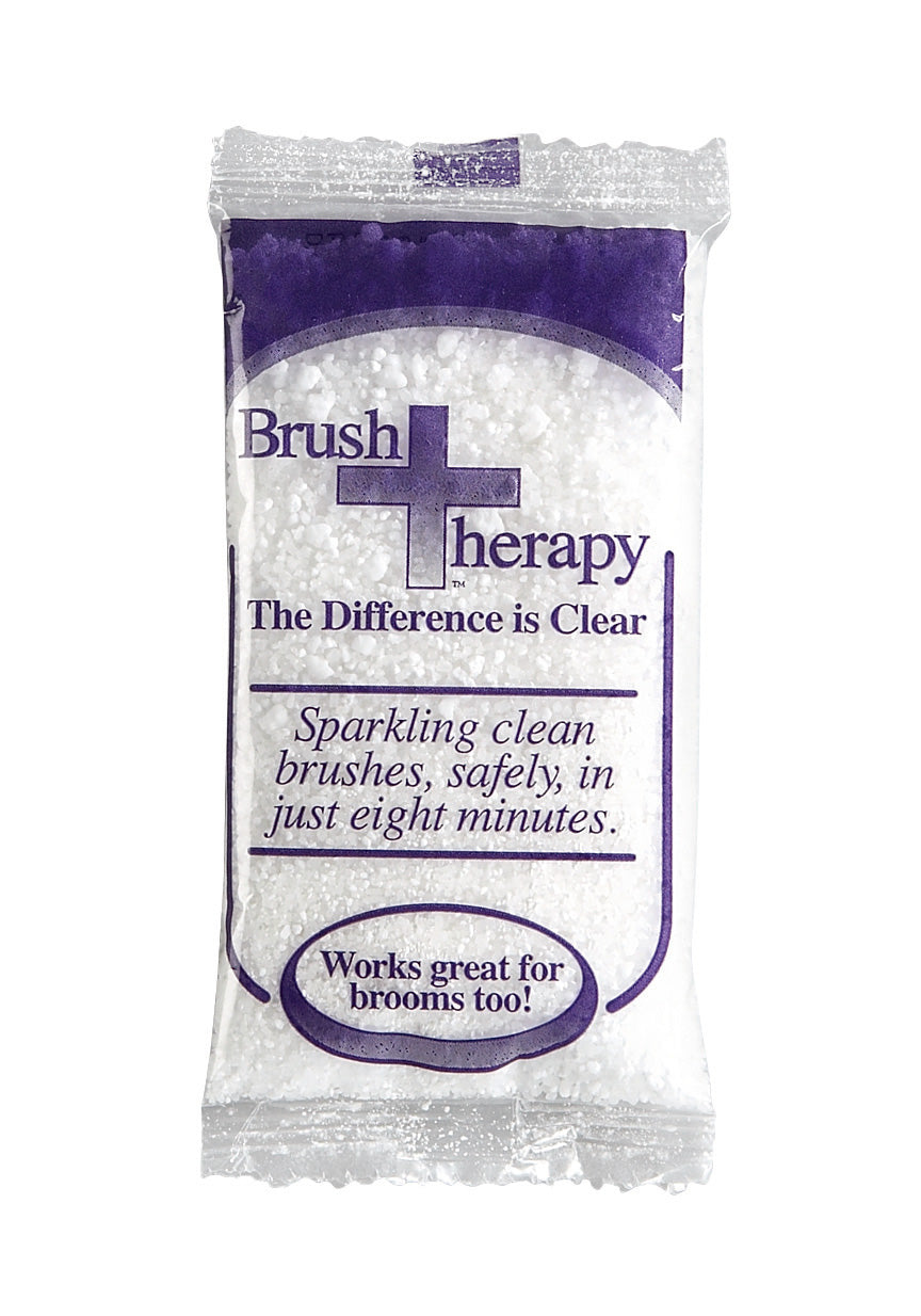 Brush Therapy gives you sparkling clean grooming brushes in just minutes and with no effort! Just pour a gallon of warm water over your brushes, add a packet of Brush Therapy, and watch as the effervescent action lifts dirt, grime and bacteria from the bristles. Trapped hair combs out easily. Soak for eight minutes, and the solution rinses away cleanly and quickly. Your brushes are left in sanitary condition for top horse care. May be used on natural and synthetic bristles. Works great on brooms, too!