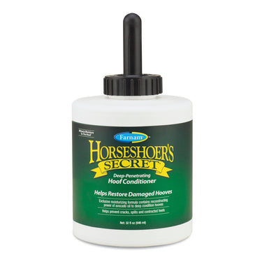 Farnam® Horseshoer’s Secret® Hoof Conditioner absorbs quickly to condition dry hooves, prevent cracks, splits and contracted heels. This exclusive pine tar-free moisturizing formula has avocado oil to deep condition hooves. It includes glycerin to attract moisture and mineral oil to hold moisture in. Helps repair damaged hooves. 32 oz.