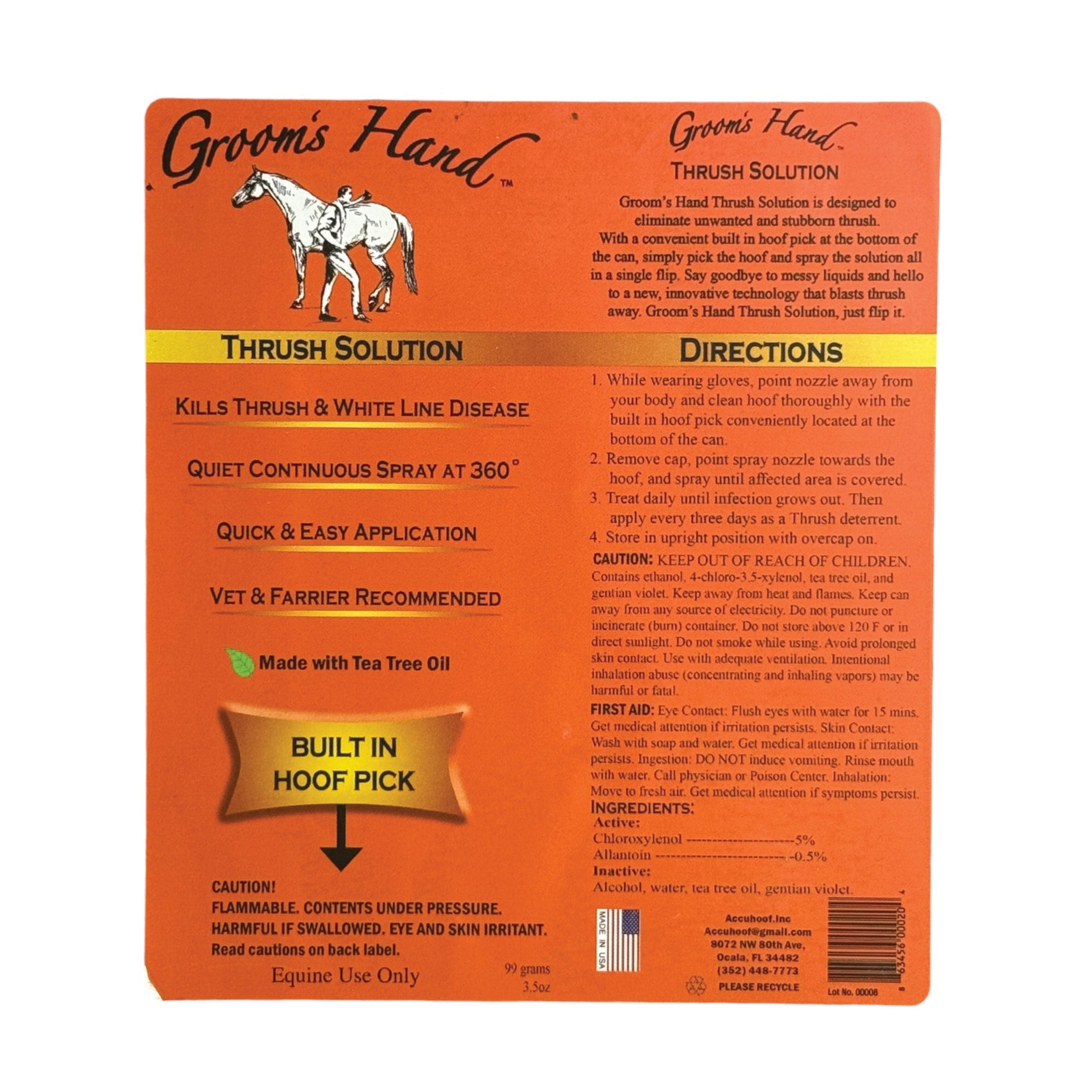 Groom’s Hand Thrush Solution® is no waste, no run-off and no mess! No more powders and gels, this revolutionary thrush and white line disease treatment comes in a convenient aerosol spray with a built-in hoof pick. Innovative technology blasts away infection and disease. Groom’s Hand Thrush Solution® formula contains the powerful chlorinated compound chloroxylenol, which is effective against both bacteria and fungus. It also contains mother natures powerhouse anti-fungal, tea tree oil, as well as the long-used gentian violet.  Non-caustic formulation with no harmful or petroleum-based products. Our formula has NO formaldehyde.  The 360-degree continuous spray application allows for zero mess and easier control with no waste. Can be used under leather and pads and also works as a dirt barrier.