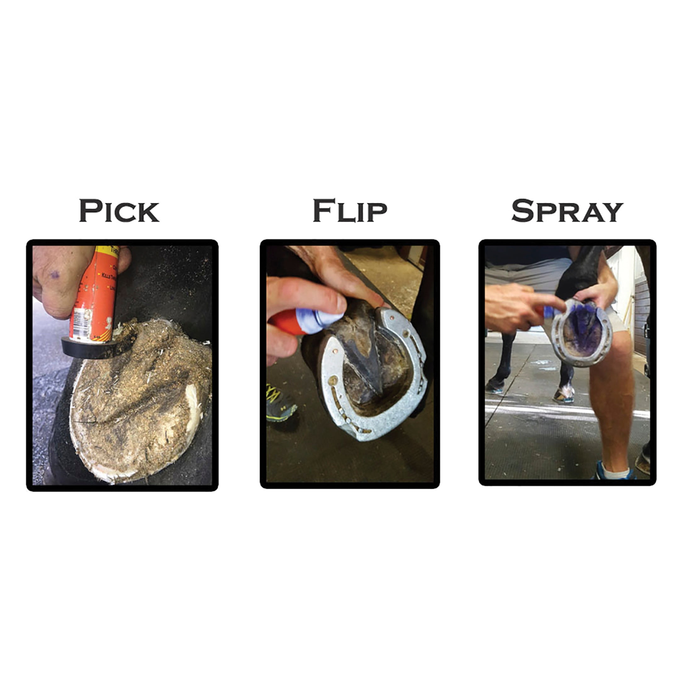 APPLICATION: Ensure the hoof is clear of debris and dry with the attached hoof pick. Wearing gloves, spray on the product to the hoof sole and walls.