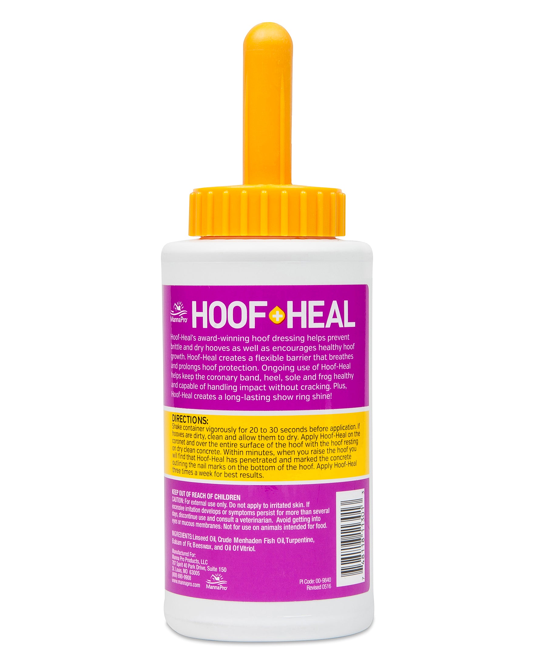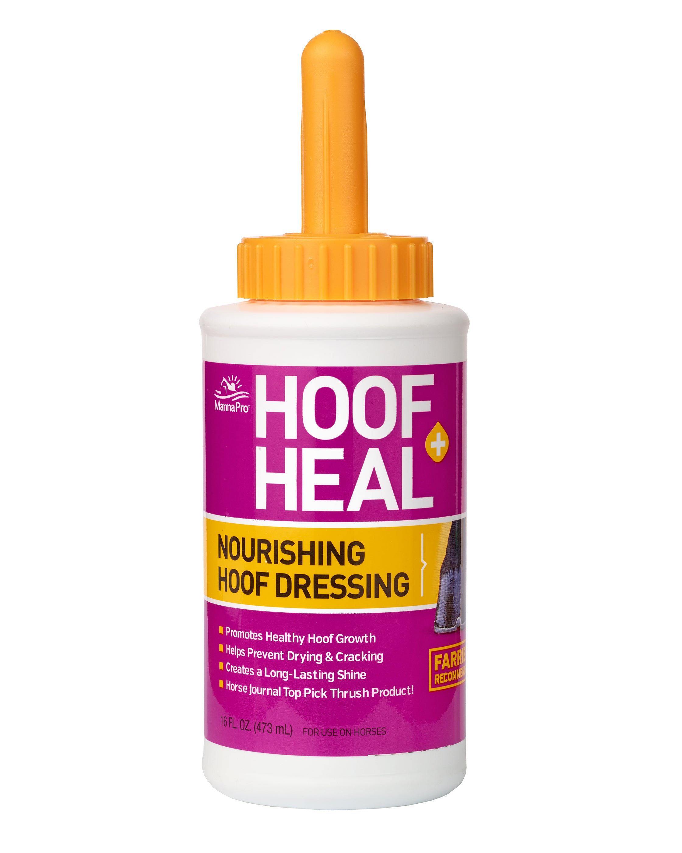 Manna Pro Hoof Heal aids in maintaining a healthy frog, sole, heel and coronary band. This hoof dressing for horses helps prevent brittle, cracked hoof walls and heels. Allows hoof to breathe. An all-weather easy brush-on-formula. Deep and rapid penetration with one application provides 3-5 days protection. 16 oz.