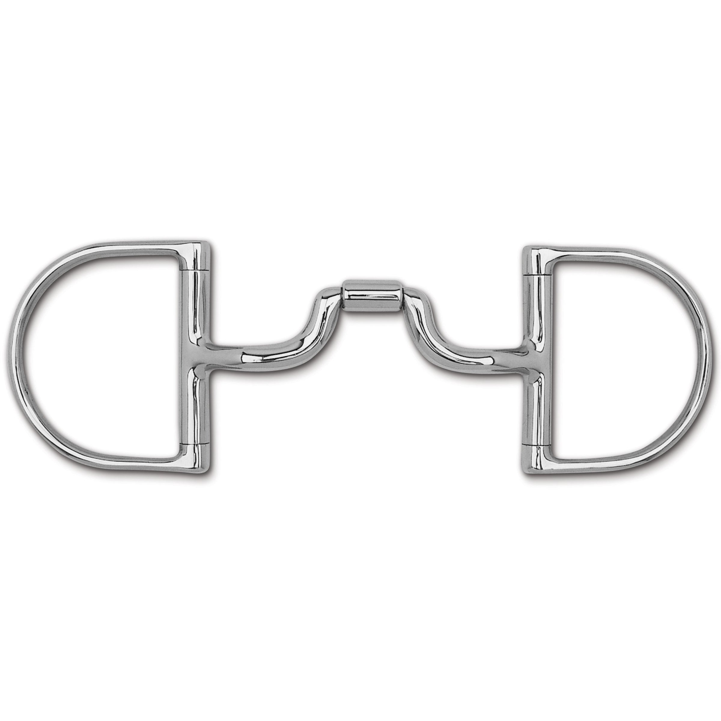 The dee without hooks is a traditional D-shaped cheek with fixed attachment of the mouthpiece. This style keeps the mouthpiece from draping on the tongue, providing a more direct signal than the loose ring. The straight side of the dee will not pull through the mouth and does not pinch.