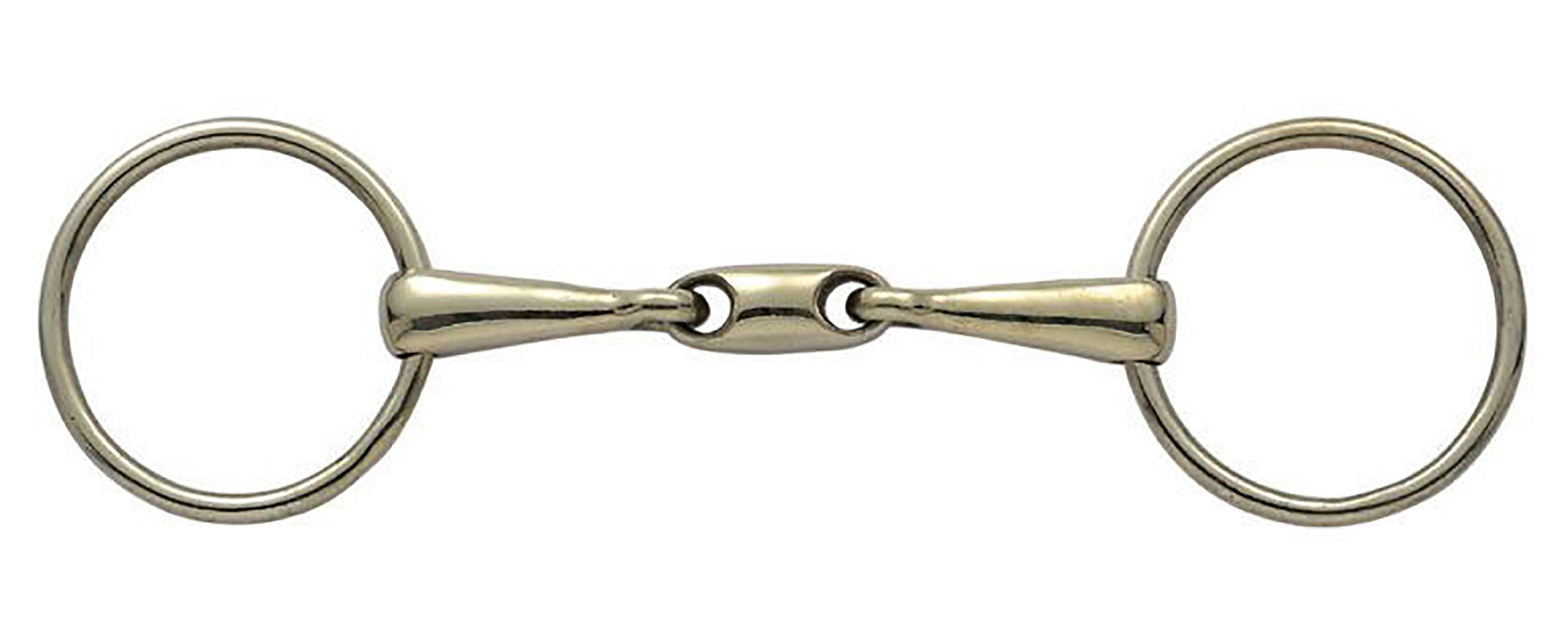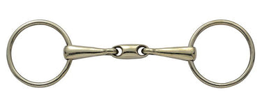 This Loose Ring Copper Alloy Training Bit with 18mm mouth has an oval center link. The design helps eliminated the nutcracker action of a single-jointed bit. The gentle rounded link is also made of copper to encourage salivation. 65mm rings.
