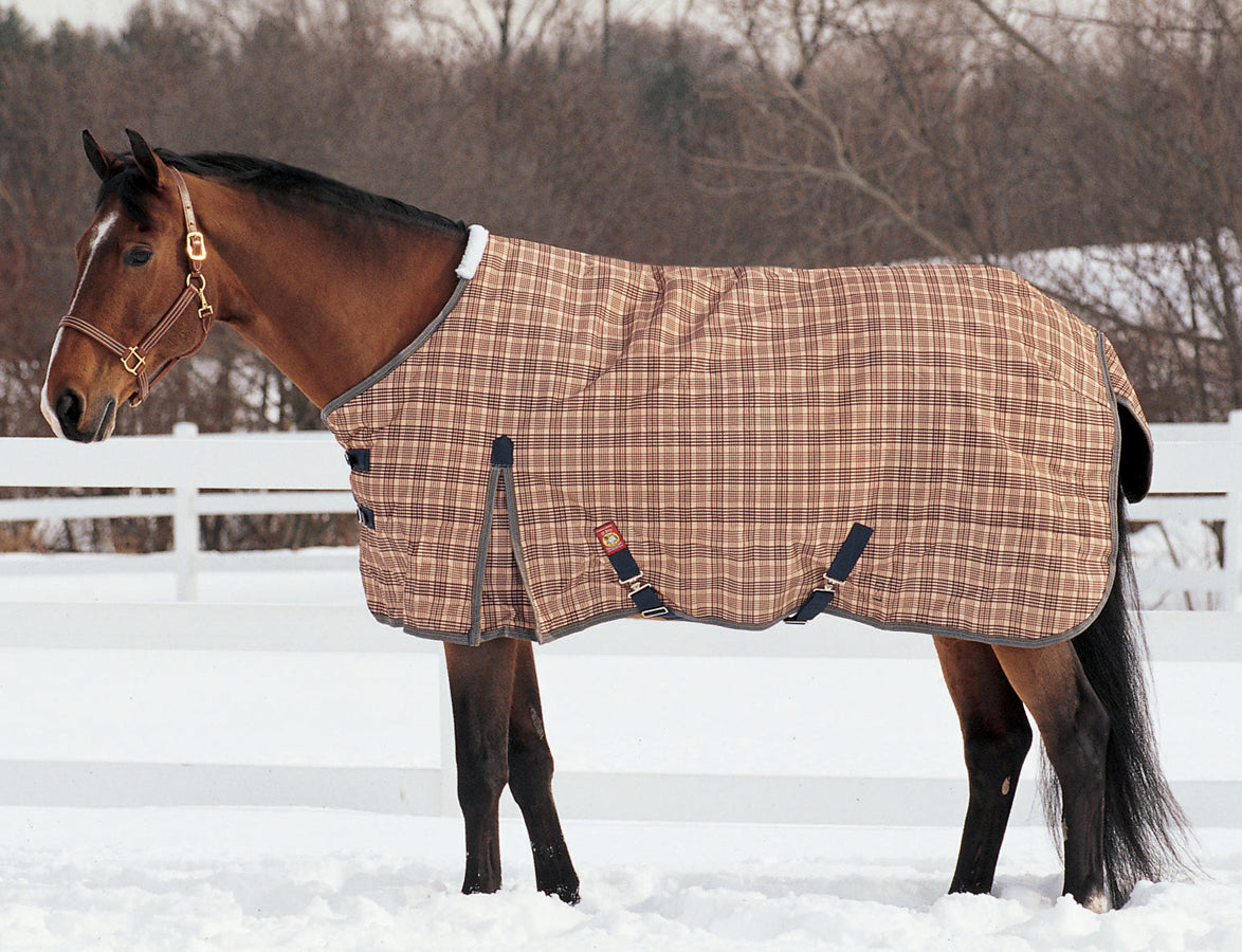Gusseted shoulders allow your horse freedom of movement. This mid-weight stays in place while your horse frolics and rolls with bias surcingles, elastic leg straps and a protective tailpiece. The 1,200 denier ripstop polyester outer shell stands up to abuse while the satin-smooth lining polishes your horse’s coat. A waterproof, breathable membrane seals out the elements yet allows vapor from perspiration to pass through to the outside, keeping your horse warm, dry and comfortable. The classic Baker plaid with navy surcingles and baker striped binding only adds to the appeal of this blanket!