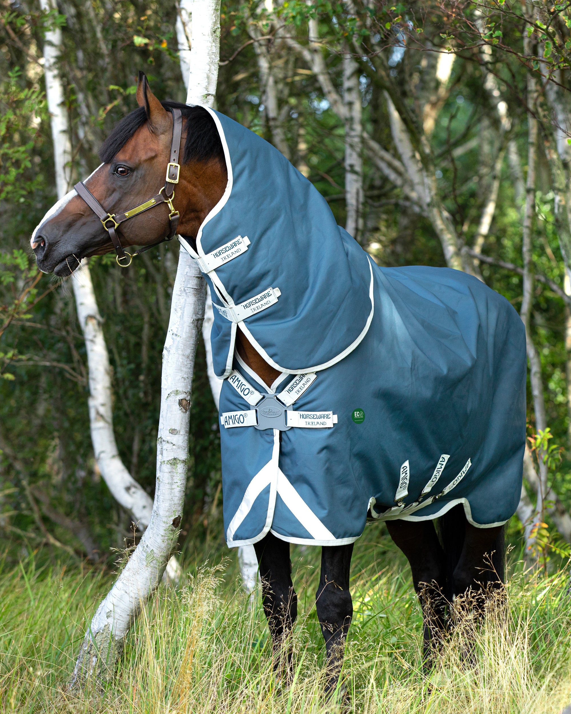 With the Amigo® AmEco 12 Plus Lightweight Turnout Blanket, Horseware® Ireland delivers innovation for a greener future. This blanket with removable neck cover is made of a textile constructed from recycled plastic bottles—218 plastic bottles are recycled to create each one. The 1200 denier rPET polyester outer is sustainable, waterproof and breathable; 100 grams of eco-friendly fiberfill insulation provides superior breathability and warmth. A sustainable shine-enhancing rPET lining prevents rubbing to support a healthy coat.