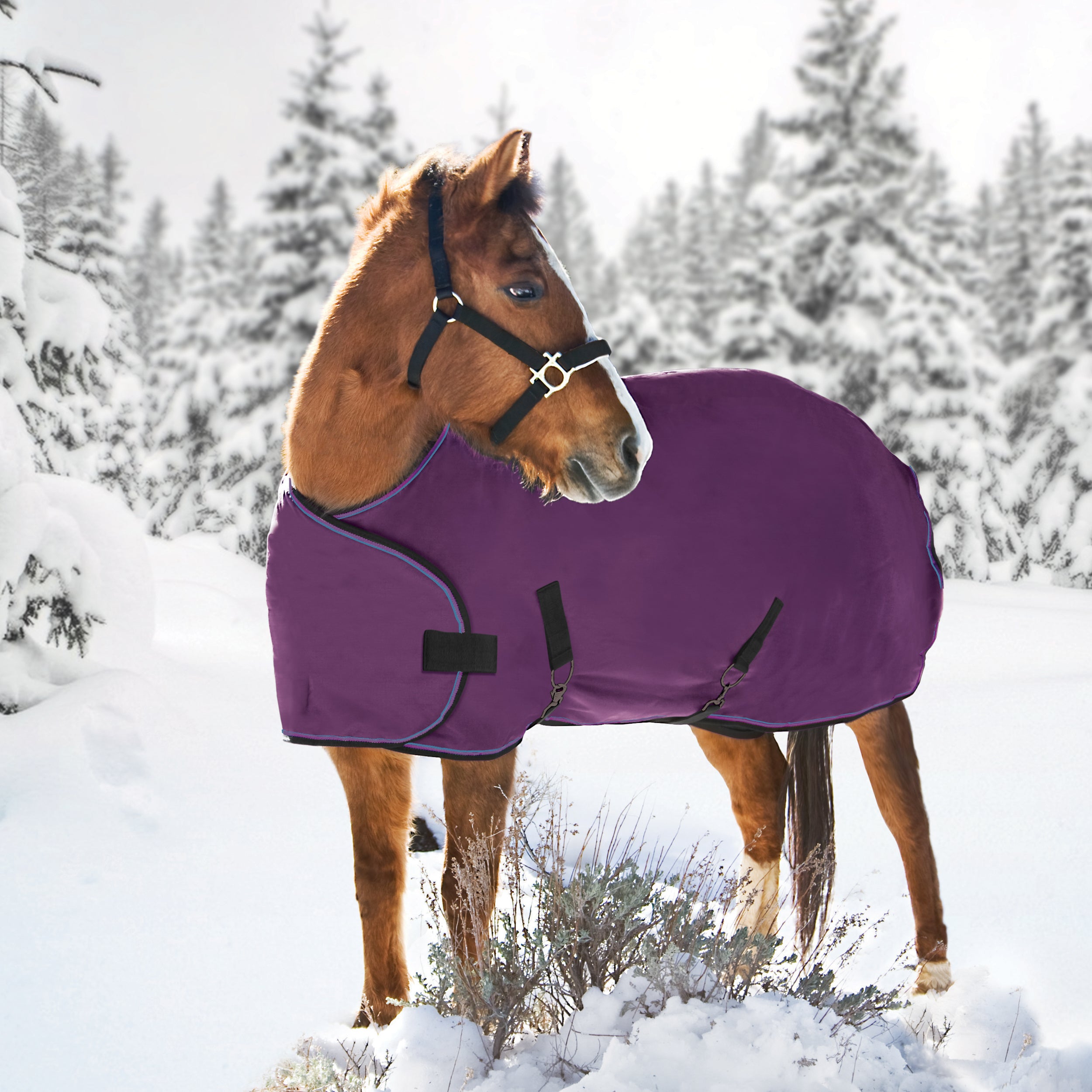 It is insulated with 180 grams of lofty hollow fiberfill to provide warmth with breathability. Velcro® brand front closure adjusts 60" to 88" to let this blanket grow with your youngster. Secures at the belly with a two 2" wide cross surcingles and includes rear leg straps.