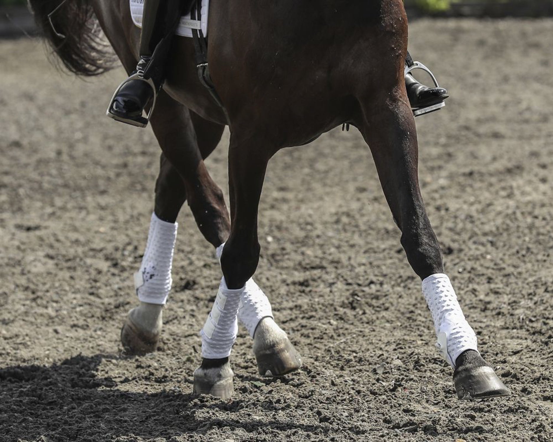 These Training Wraps feature Stomatex® material originally designed for human athletes. Stomatex provides four-way stretch to enable use around mobile joints and has an outstanding ability to keep the skin dry. It is commonly used to make heat acclimatization suits, padding for wheelchairs, special wet suits and sports-injury support bandages. Its breathability helps horses’ legs stay cool and helps maintain an ideal skin temperature over extended periods. It efficiently moves trapped vapor molecules from beneath the fabric by the flexing action of minute dome-shaped chambers which each contain a tiny pore in the center.