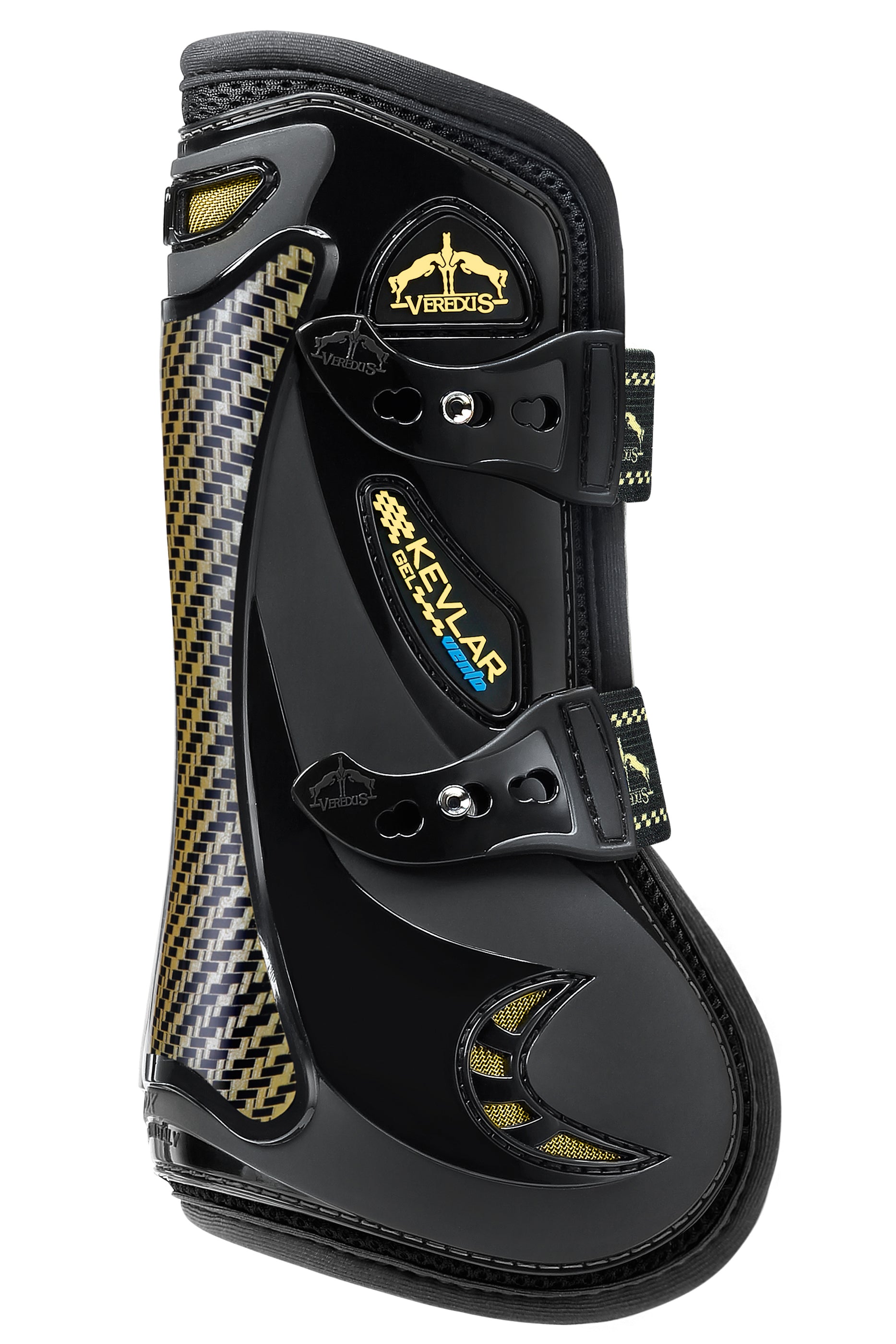 Veredus® Kevlar® Gel Vento™ Open Front Boots offer leg protection for jumpers. The tendon boot features a Kevlar protective layer. This synthetic material is lightweight, impact-resistant, hardwearing and five times stronger than steel.