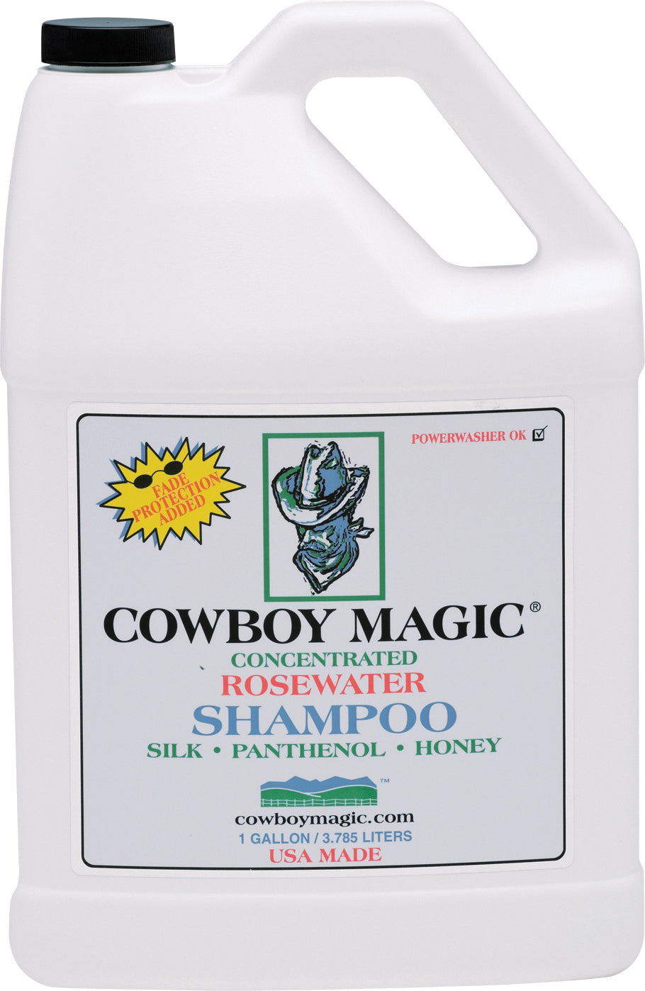 Cowboy Magic® Concentrated Rosewater Shampoo is a double-action formula with ingredients that work fast to break down and dissolve dirt and unwanted matter gently without damaging your horse’s hair. Panthenol and silk protein in the formula penetrate hair strands and condition your horse’s skin to prevent dryness. Silk molecules restore hair’s vibrancy by reflecting prism light to give hair a rich, natural shine. This pH balanced shampoo can be used full strength or diluted in an up to 20-to-1 ratio, and it rinses clean easily. Gallon.