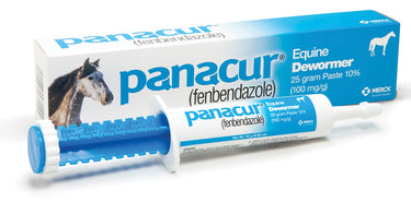 Panacur® Paste dewormer from Merck Animal Health contains 10% fenbendazole as the active ingredient to kill four common internal parasites in horses. Effective against large and small strongyles, pinworms and ascarids (roundworms), Panacur has an apple-cinnamon flavor that makes it readily acceptable to horses and therefore easy to administer. One convenient, prefilled 25 gm oral syringe treats 1,100 pounds; syringe is marked in 250 pound increments. This dewormer may be administered to pregnant mares and young foals.