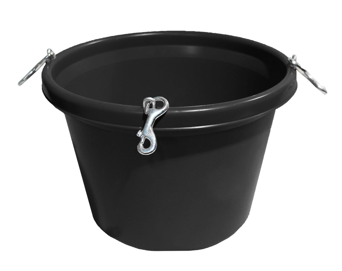 The Fortiflex® 30-Quart Feed Tub has a curved rim and deep body to keep food in the bucket. Ideal for messy eaters, it has snaps for hanging. Black buckets are also available with clamps for hanging.