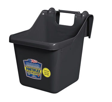 The Fortiflex® Hook Over Fence Feeder makes giving your pastured horse grain rations easy! Slip it over a fence rail and feed. Heavy-duty rear prongs hold it in place. No hardware is required, but top lip screw holes allow permanent installation. A reinforced front lip doubles as a grip. Made of Fortalloy rubber-polymer blend, it resists cracking. UV-protective additives ensure long life. Works well for feeding other farm animals, too. 16 quart capacity. Weighs approximately 3 pounds.