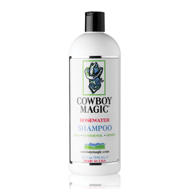 With its double-action formula, the ingredients in Cowboy Magic® Concentrated Rosewater Shampoo work fast to break down and dissolve dirt and unwanted matter gently without damaging your horse’s hair. Panthenol and silk protein in the formula penetrate hair strands and deep condition the skin to prevent dryness. Silk molecules restore hair’s vibrancy by reflecting prism light to give hair a rich, natural shine. This shampoo can be used full strength or diluted in an up to 20-to-1 ratio, and it rinses clean easily. Quart.