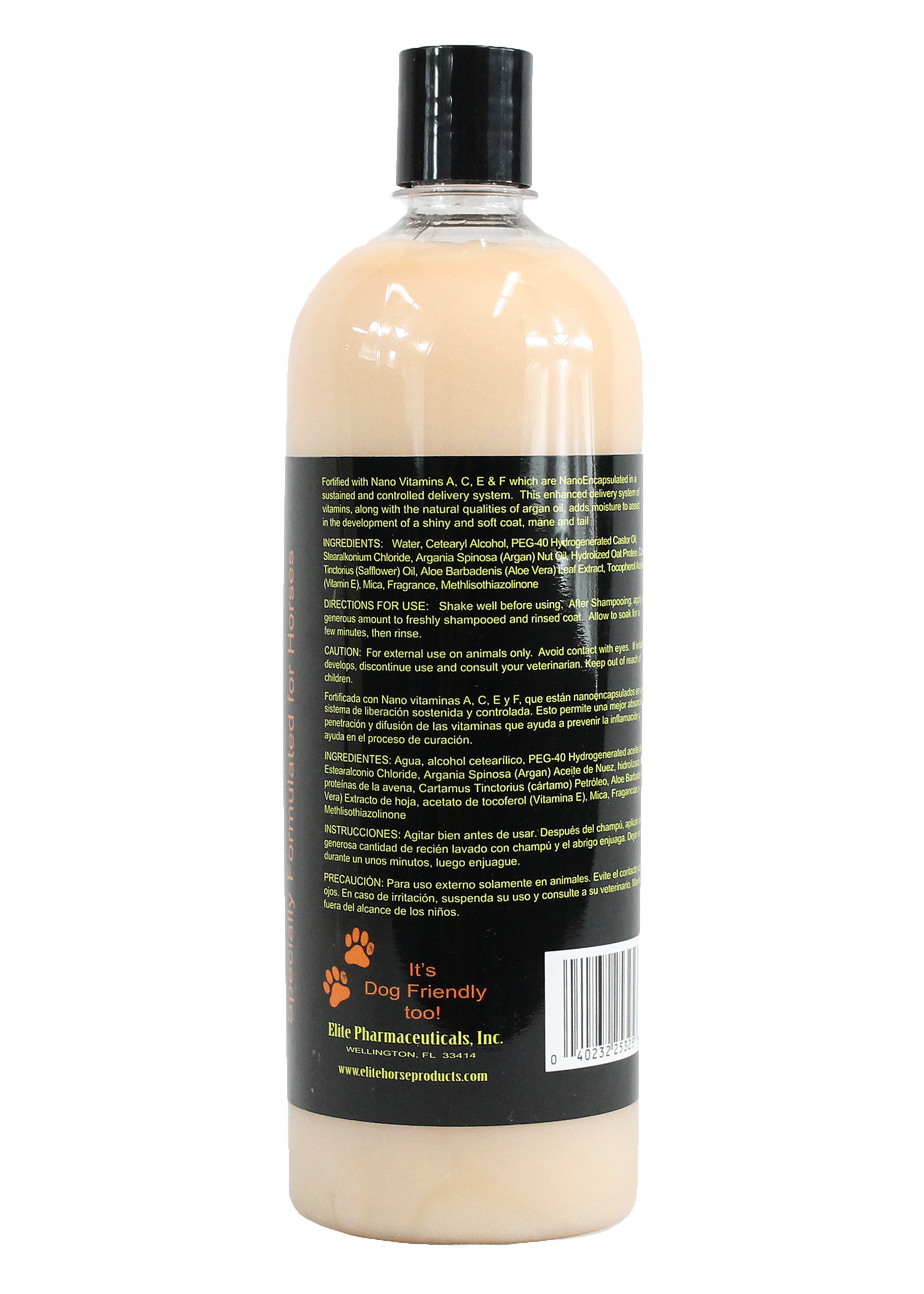 E3® Elite Equine Evolution Argan Oil Conditioner is fortified with nano vitamins A, C, E & F, which are nanoencapulated in a sustained and controlled delivery system. This system of vitamins, along with the natural qualities of argan oil, adds moisture to hair to assist in the development of a shiny and soft coat, mane and tail. 32 ounces.
