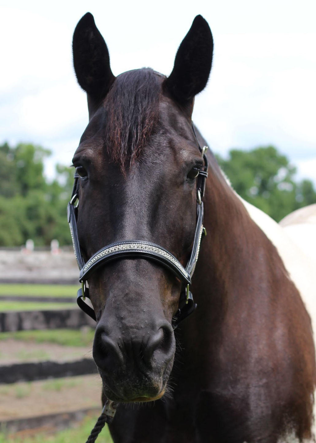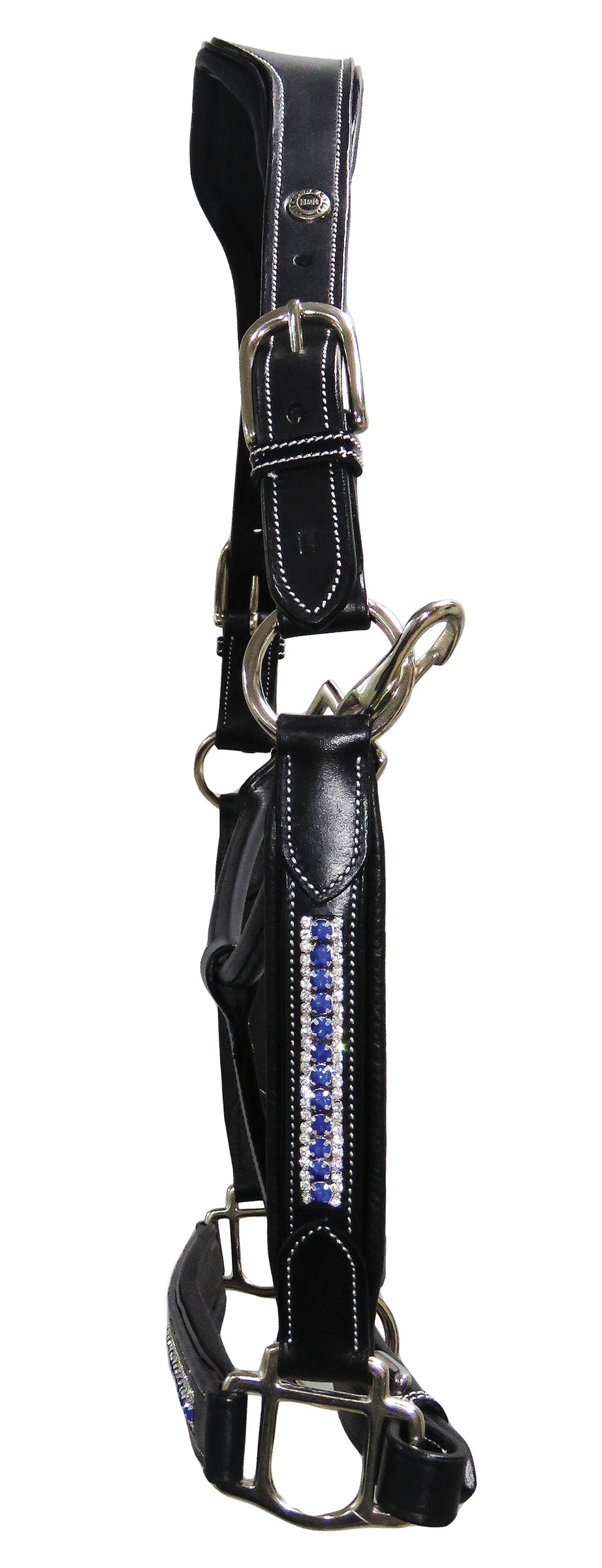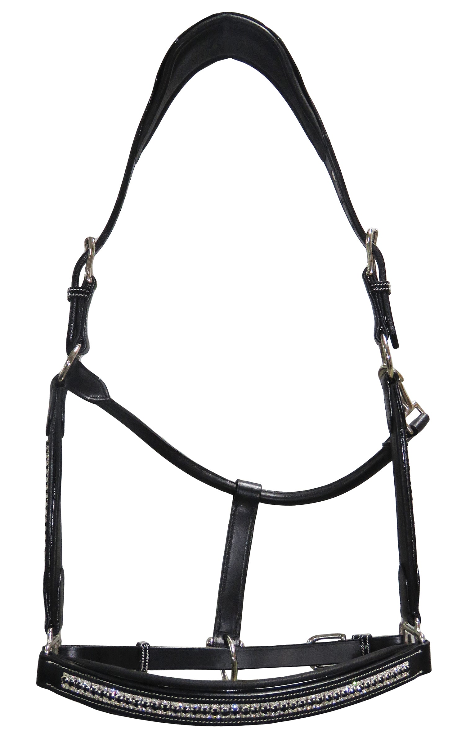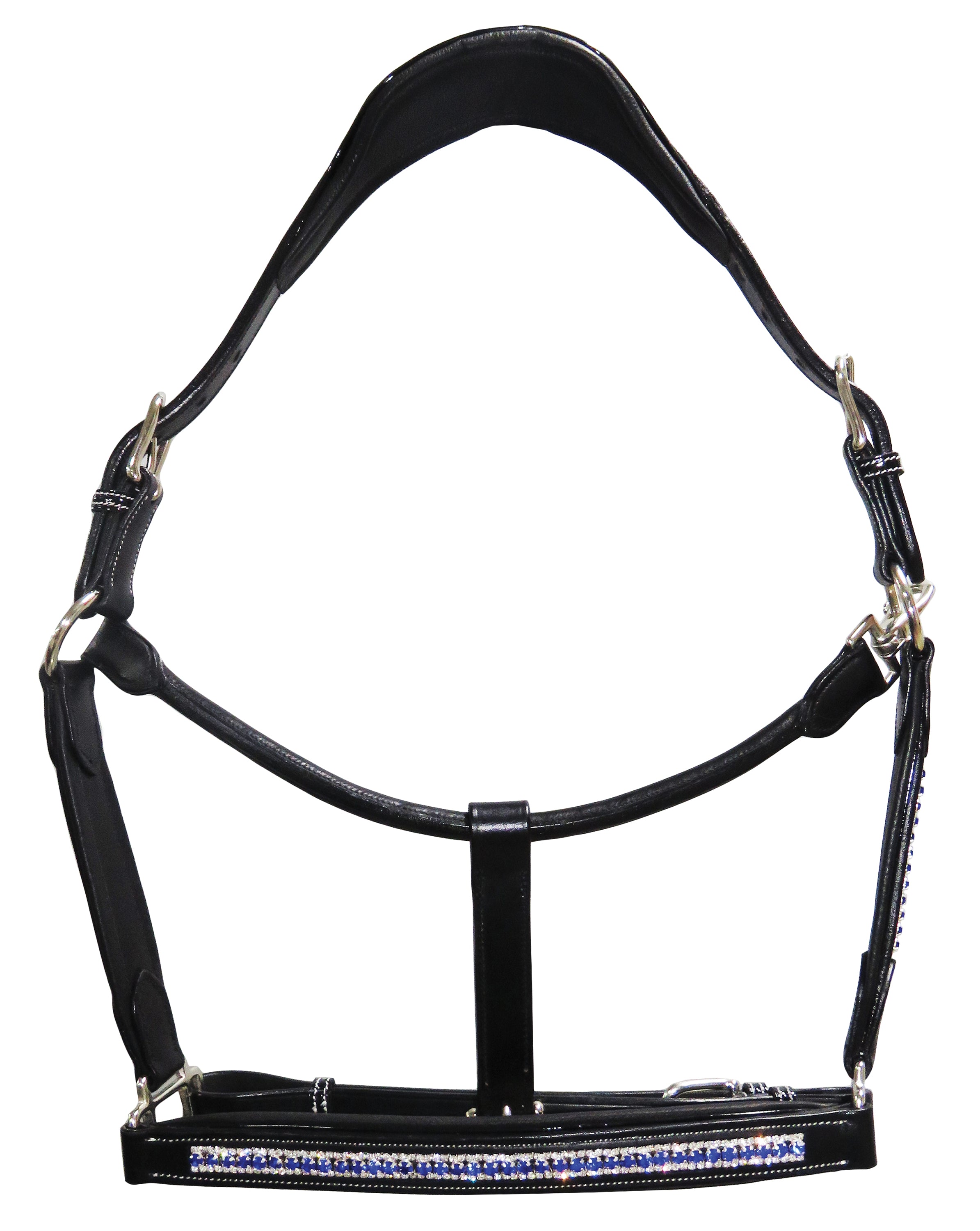 The Padded Jewel Halter by Henri de Rivel shows off your sense of fashionable style. Made of soft, high-quality leather, this eye-catching halter features three rows of crystals on the nose and cheeks accented by patent leather piping. Luxuriously padded for horse comfort, it has a two-buckle crown, adjustable chin and rolled throat with snap closure. Fitted with long-wearing stainless steel hardware throughout.