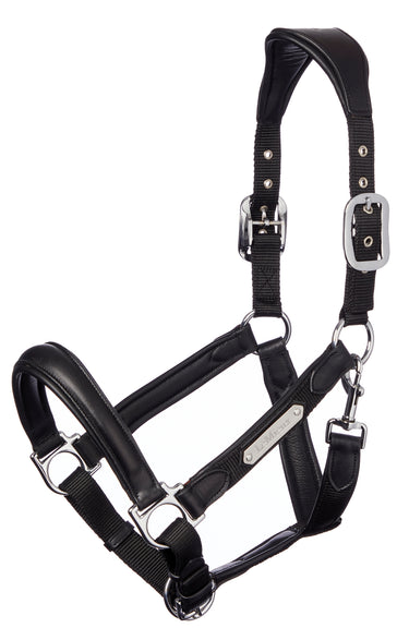 The LeMieux® Capella Halter combines strong, luxury leather with durable, reinforced nylon and solid metal fittings. The design features a padded, contoured, pressure-relieving crownpiece that boosts horse comfort by distributing pressure over a wide area. Leather padding lines the leather noseband and the nylon web cheekpieces, throatlatch and jaw strap.