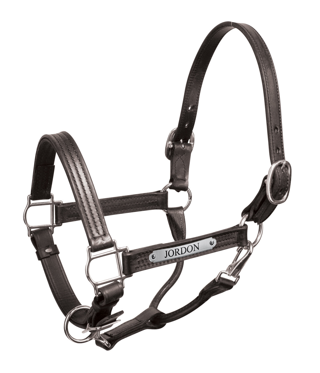 The nameplate will match the color of your halter’s hardware. A halter with brass hardware comes with a lacquer-coated brass nameplate. A halter with stainless steel hardware comes with a lacquer-coated nickel alloy nameplate.