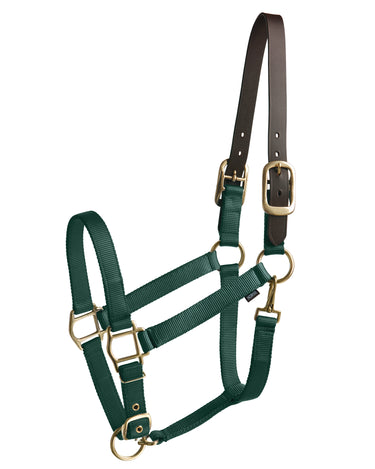 Suffolk™ Heavy Nylon Halter with Breakaway Crown delivers reliable, long-lasting service. The replaceable leather crown is intended to break and free your horse if the halter gets caught on an object. In triple-layer 1" wide heavy-duty nylon webbing with sturdy brass hardware.