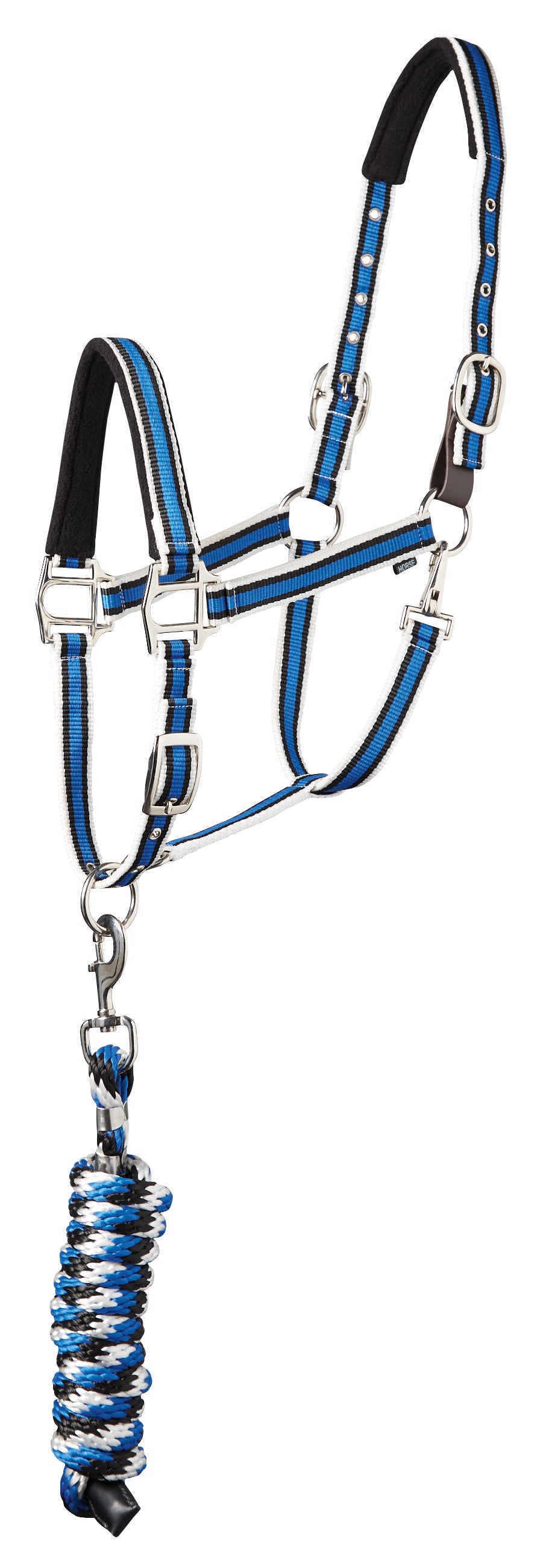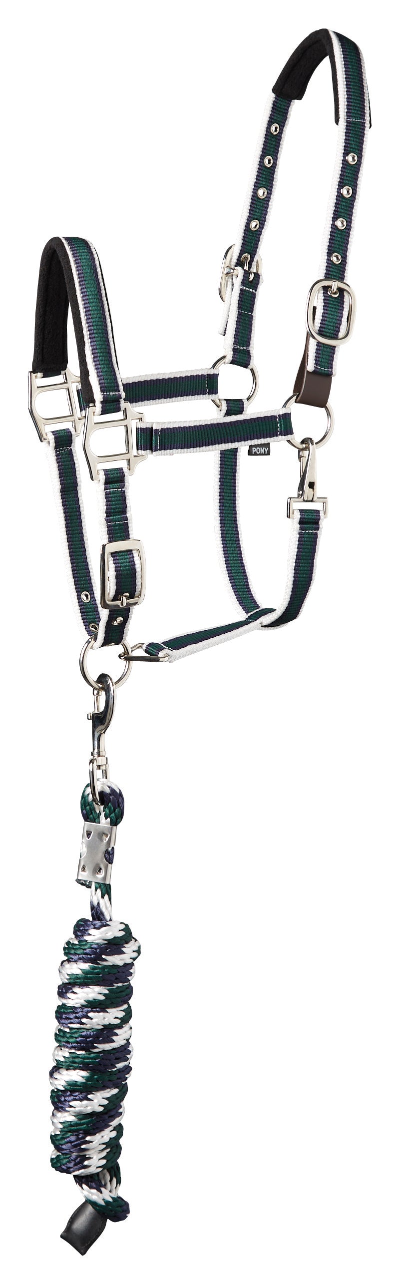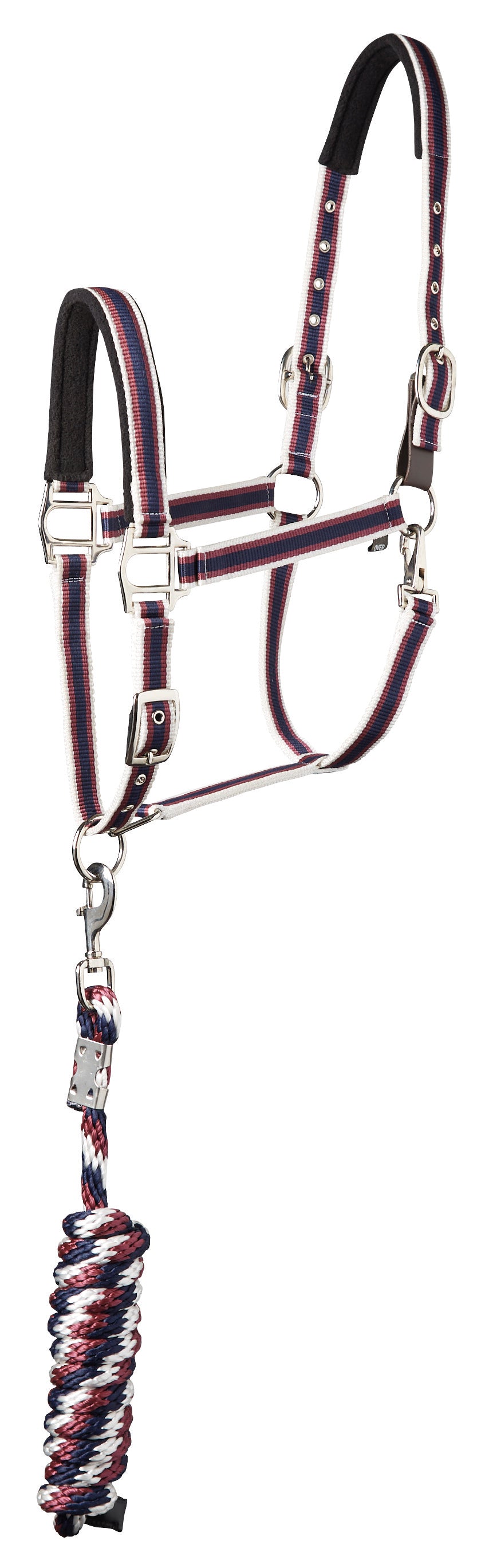 The Suffolk™ Padded Striped Halter & Lead set features a stylish nylon web halter with replaceable leather breakaway tab. Soft fleece lines the crownpiece and noseband. Stainless steel hardware stands up to wear. The tricolored poly lead, 8' long, coordinates with the halter.