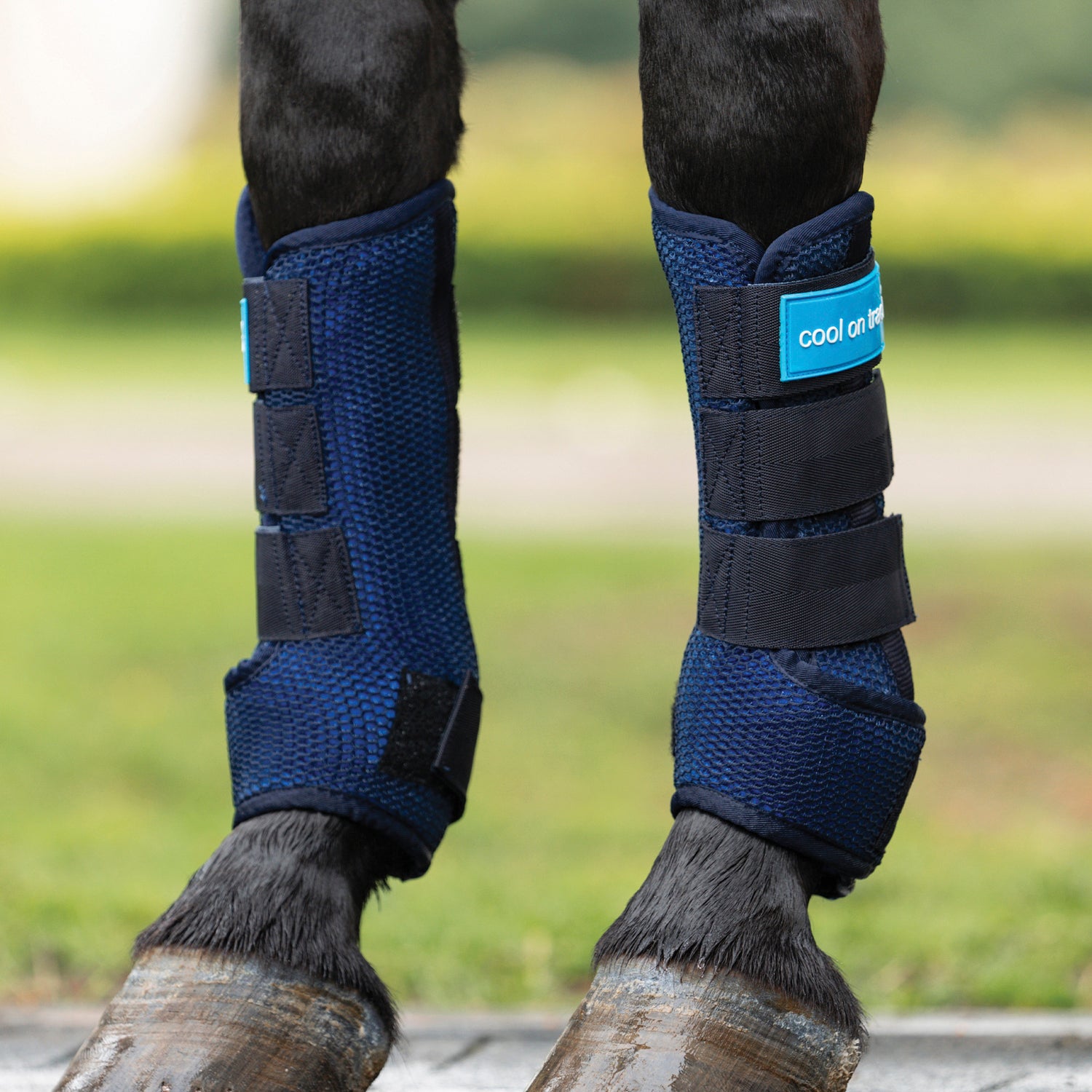 Back on Track® Cool on Track™ Quick Wraps in a classic model that molds to the horses lower leg and applies a cooling effect to the tendons. Cool on Track™ Quick Wraps help bring down the temperature after intense work and exercise. Cold therapy may reduce the risk of problems resulting from overheated tissues - as well as reduce inflammation, swelling and pain. The material will retain its cooling ability as long as it remains wet. The product can be reused by soaking it again. The outside is made of a sturdy mesh fabric with large mesh that allows efficient evaporation of water and retains the shape of the boot. The Cool on Track™ Quick Wraps are closed and held in place by a broad hook-and-loop strap. Sold in pairs.